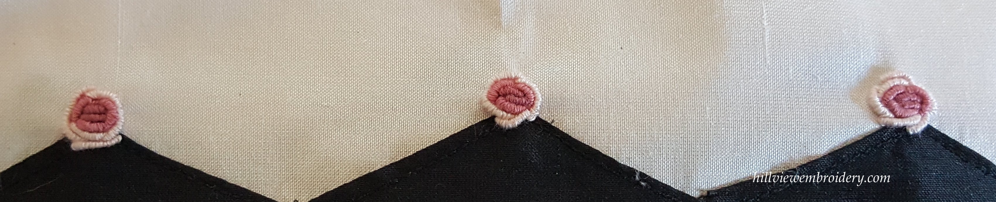 I haven’t done bullion knots for a long time, so it was a good little project to get back into the swing of them. I’m one of those people who quite enjoy working bullion knots (even though they don’t always work!) – I know they tend to be a love or hate relationship with some embroiderers! My first rose wasn’t quite right, but after that they seemed to work out OK.