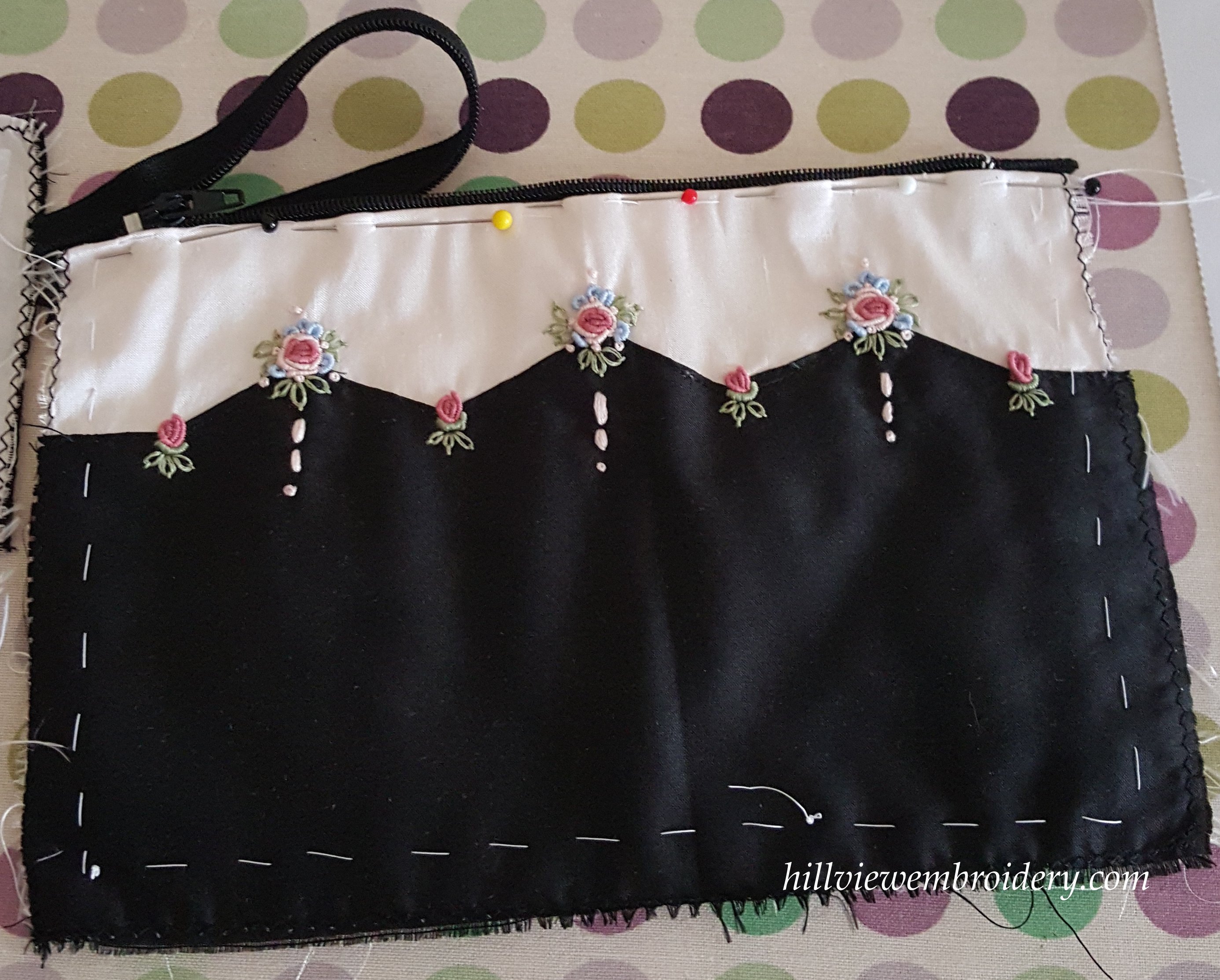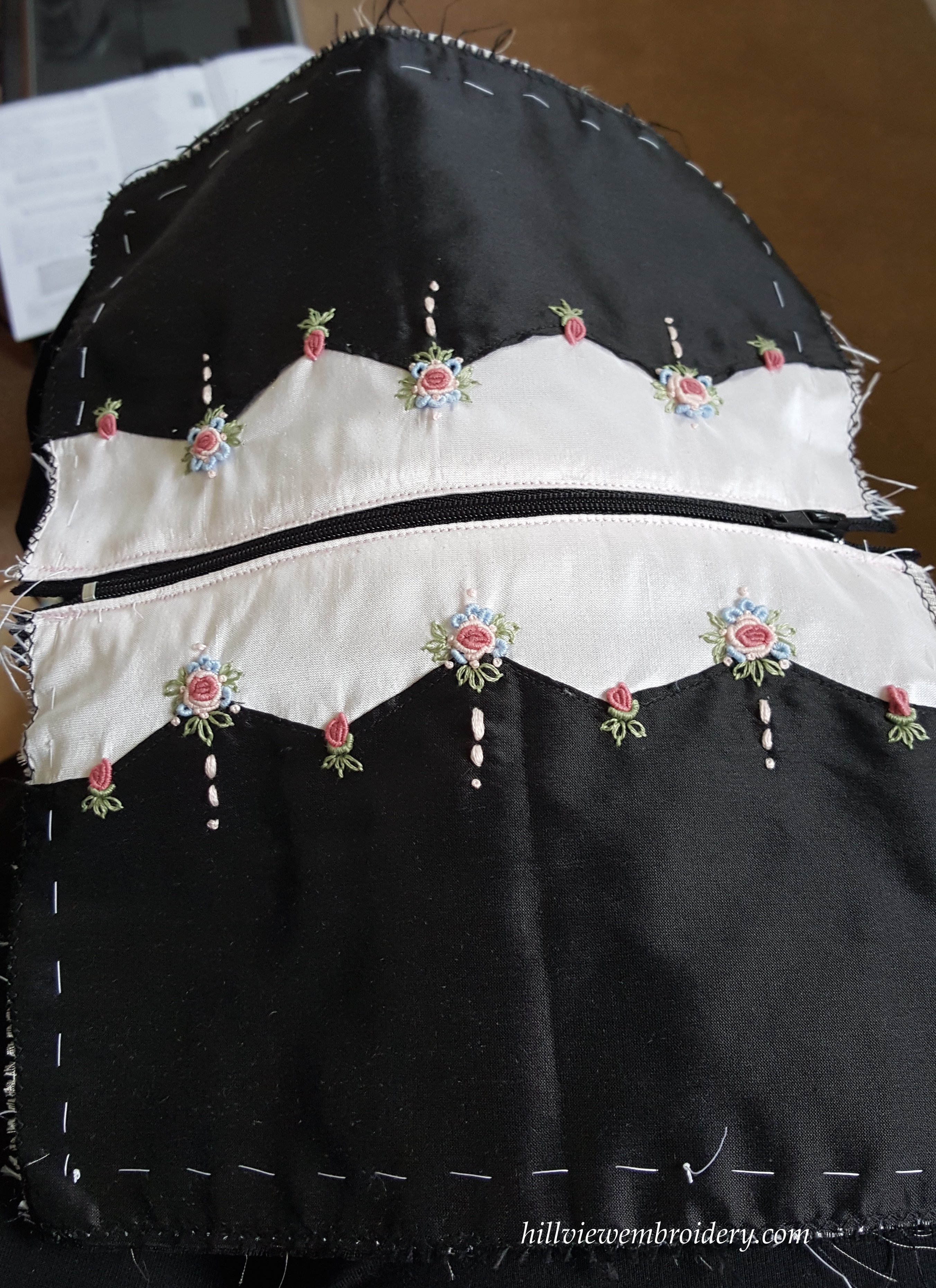 I decided to not draw the design on the fabric, and chose to do it all by sight. On the whole this didn’t pose any problems, although my little granitos could have been more identical had I drawn some guidelines in. I admit, I was quite pleased with how things were going when I had my two sides embroidered.