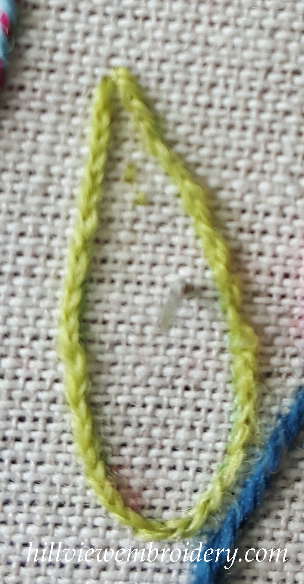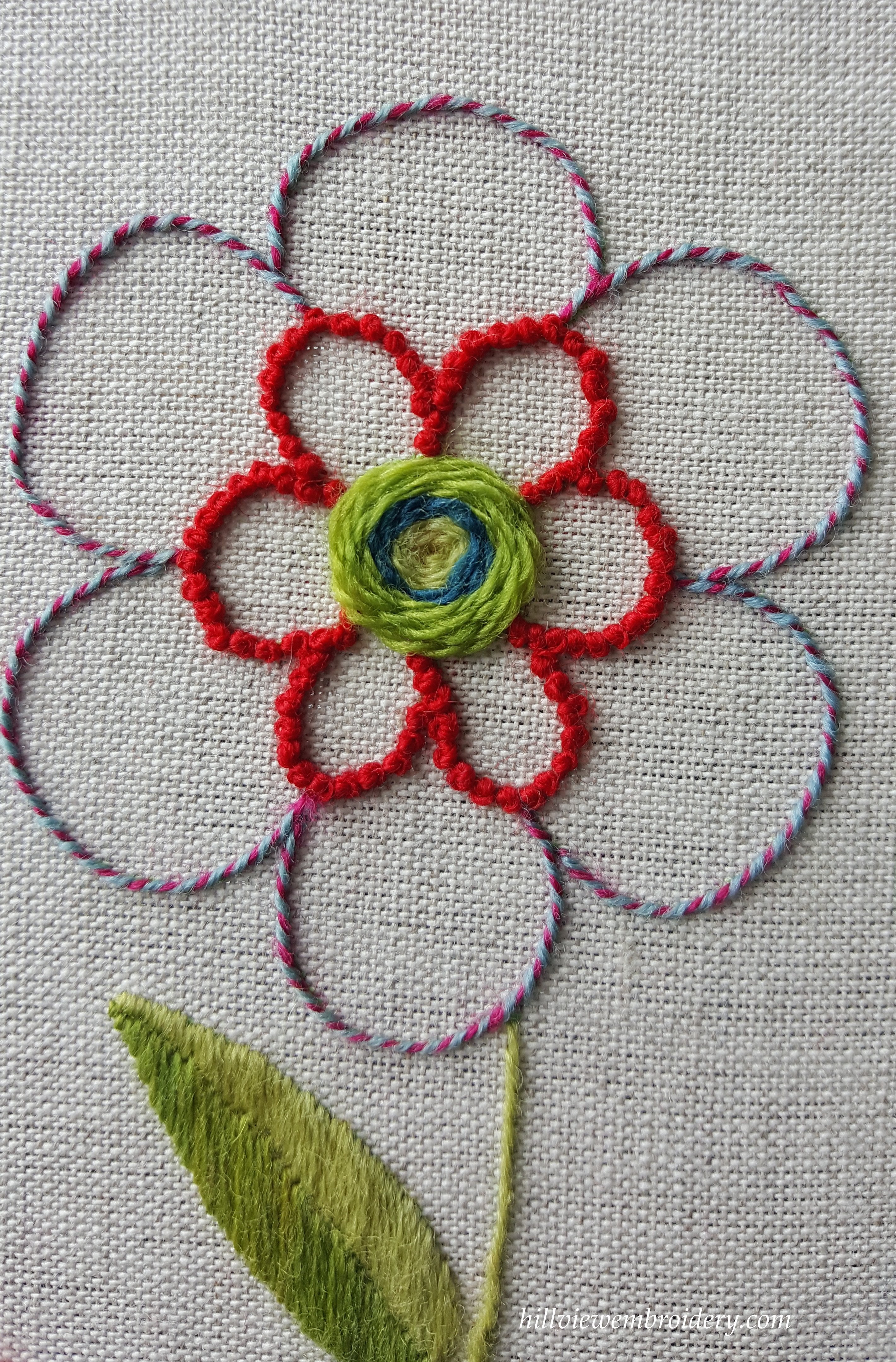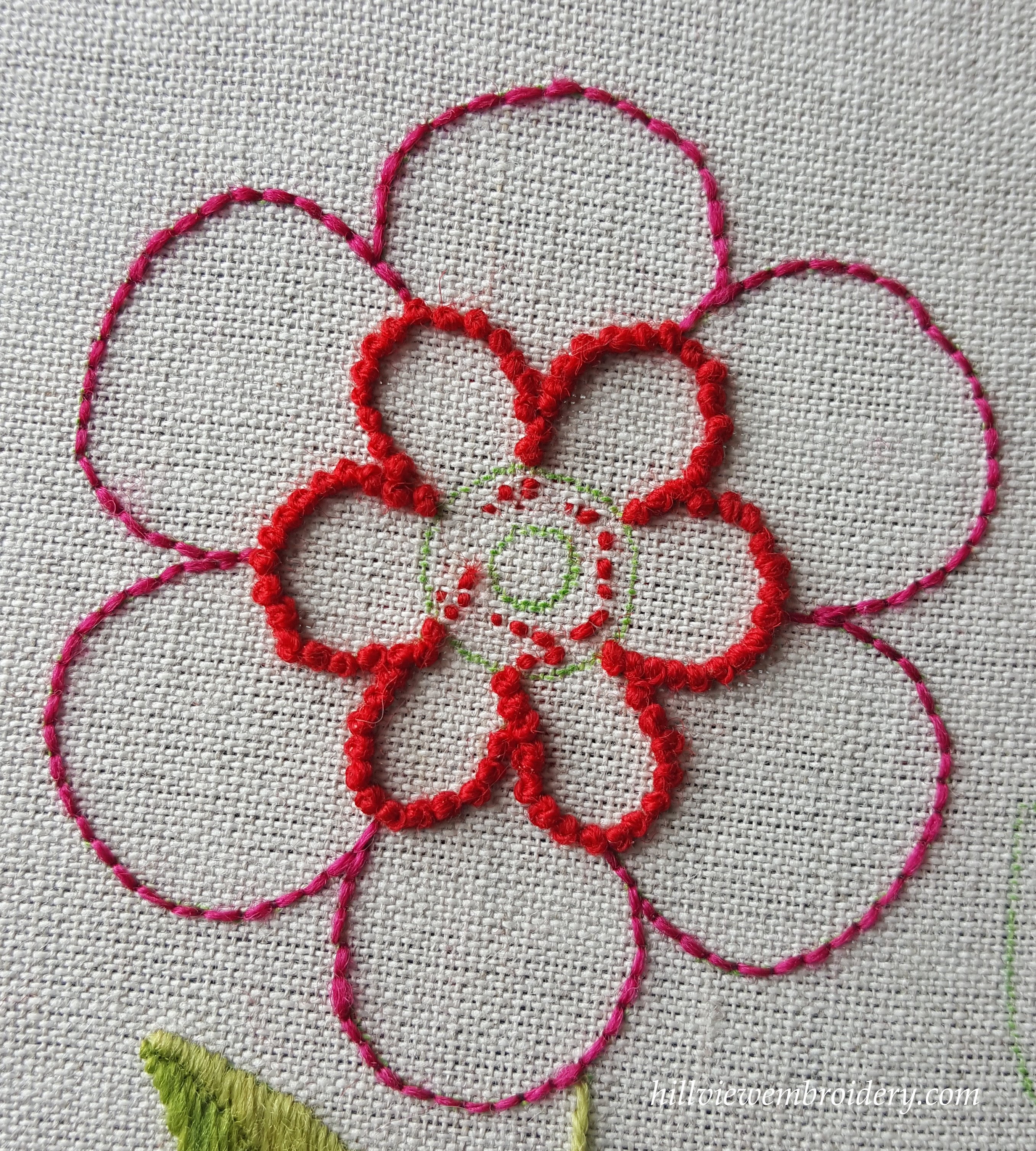 The first stitch we went through was stem stitch. One that I have used lot before! The interesting point I learnt here is that I have been ‘pulling’ the thread in the wrong direction as I complete each stitch. I have a habit of pulling the thread through in the direction of the loop, when I should be pulling it through in the direction of the stitching line. My main problem with this stitch was getting each stitch consistent in length. One of the stems I completed at home was probably the best for this, but the last one I completed was not so good! Something to work on.