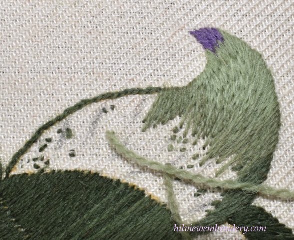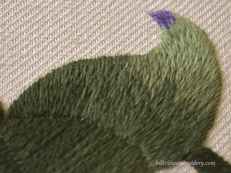 The majority of my fourth lesson was spent on the long and short stitch on the top left hand leaves. I have always thought that the outline you put in with split stitch was to be put in a mid-range colour of your colour groupings. However I learnt that the best way to do this is to actually change your thread colour so your split stitch outline matches the colour you want to stitch in that area. So a little more fiddling around, but it does make sense when you stop and think about it! To work some of my accent colour into the piece (this is a contrasting colour from the other two main colour groups you use extensively on your piece, which is part of the subject brief), I decided the tip of my leaf wouldn’t be in green, but in a few stitches of the lighter purple. I actually really like the effect! Another tip I learnt when working the tip is the first stitch doesn’t ‘stop’ on your split stitch line. Instead, it is taken a distance further (of more than I would have expected-about three millimetres). This gives the shape (in my case a leaf), a nice point and helps to shape the leaf. Obviously this isn’t going to be appropriate for all shapes, however it’s a good thing to keep at the back of your mind for any shape where you would like a point. The stitches subsequent to this initial first stitch are then stitched just over the split stitch line.