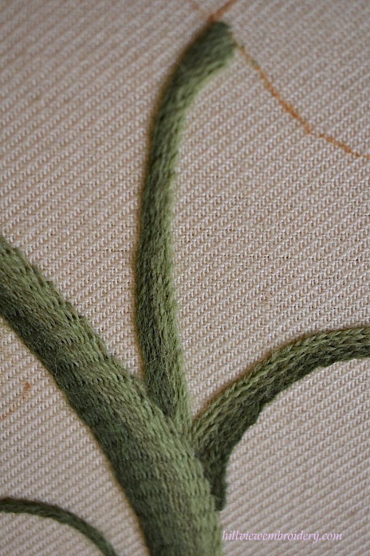 The block shading section under the main stem I eventually decided to work with one of the orange colours and two greens, as I am a little worried the piece is looking too green. I’m not overly happy with my first row – you can see where I went too far above the split stitch in two spots. I also got a little confused as to how to finish the stitching on the sides, so I’m hoping it is ok. One thing I found a little odd with this stitch is the way in which it is stitched – unlike long and short stitch and tapestry shading, rows subsequent to the first row are worked in the same direction as the first row each time, and the stitches are taken down into the first row. In long and short stitch and tapestry shading, the stitches are worked up through the sitches and down into the fabric to give a smoother finish. I’m still not sure if I should have made the third colour here an darker orange or not, but with the squirrel being all orange, I’m hopeful the colour balance is going to be ok. But I might yet take it all out and start again, so lets see!