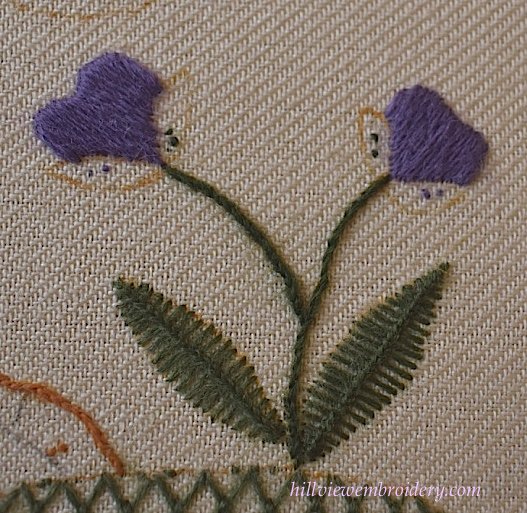 Wow time really does fly when you are having fun! I have now completed lessons four and five of my first module as part of the RSN Certificate in Jacobean crewelwork (so I’m more than half way through the module!), and I have a lot of homework this fortnight (which is by Friday!). One thing I will say, is there is a lot of homework to complete between each class – much more than I imagined. I’m neglecting a lot of things (mainly boring ones like housework and grocery shopping, but also fun ones like blogging and telling you all about it!) as I am finding it very ‘consuming'(in a good way!). I’m loving the process and everything I’m learning. My husband is a little miffed at the status of some home things, but he is very supportive and doing most of it for me! When I look at the piece as a whole, I feel I will be getting close to the finish line if I can get all my homework done.