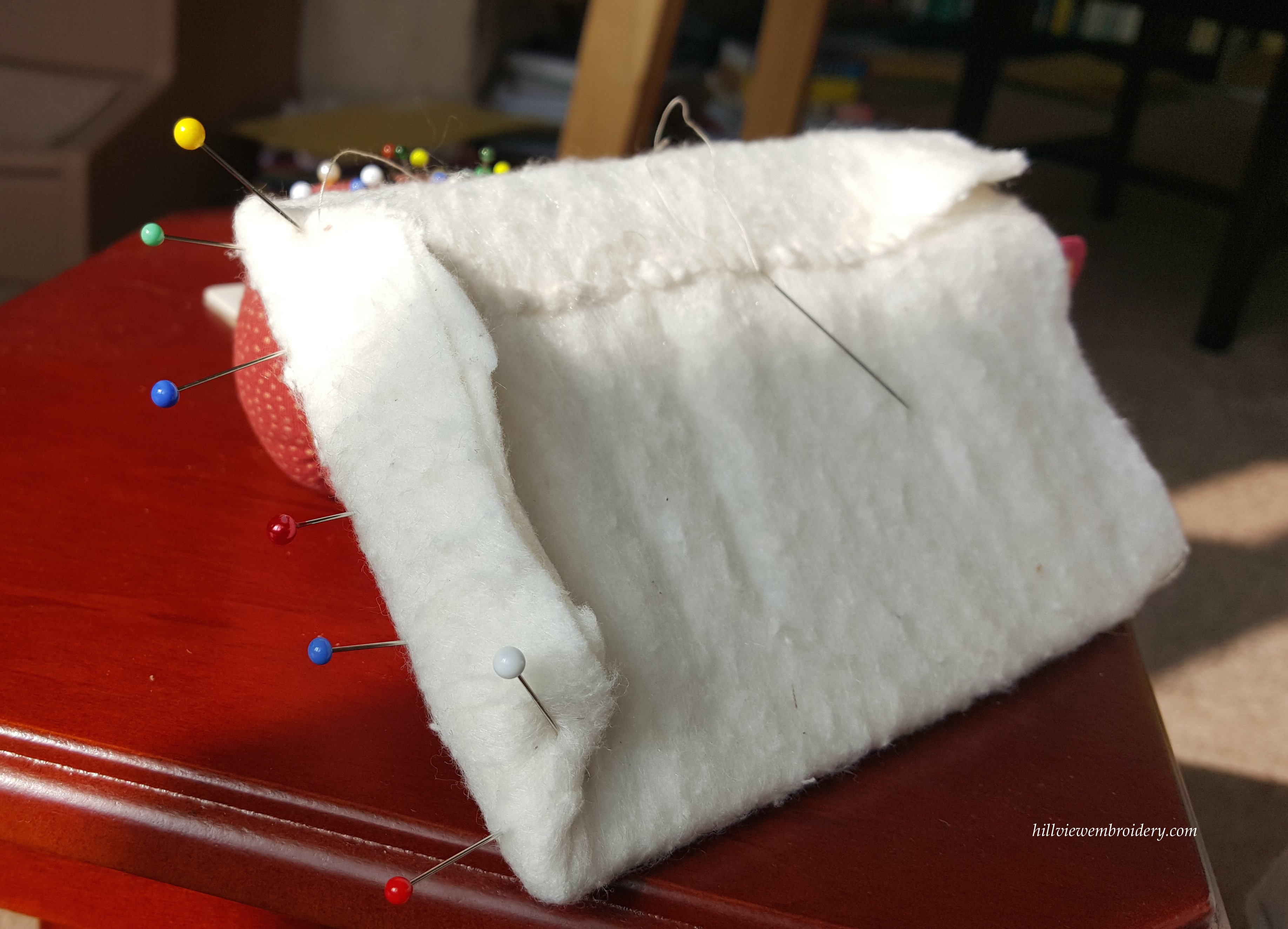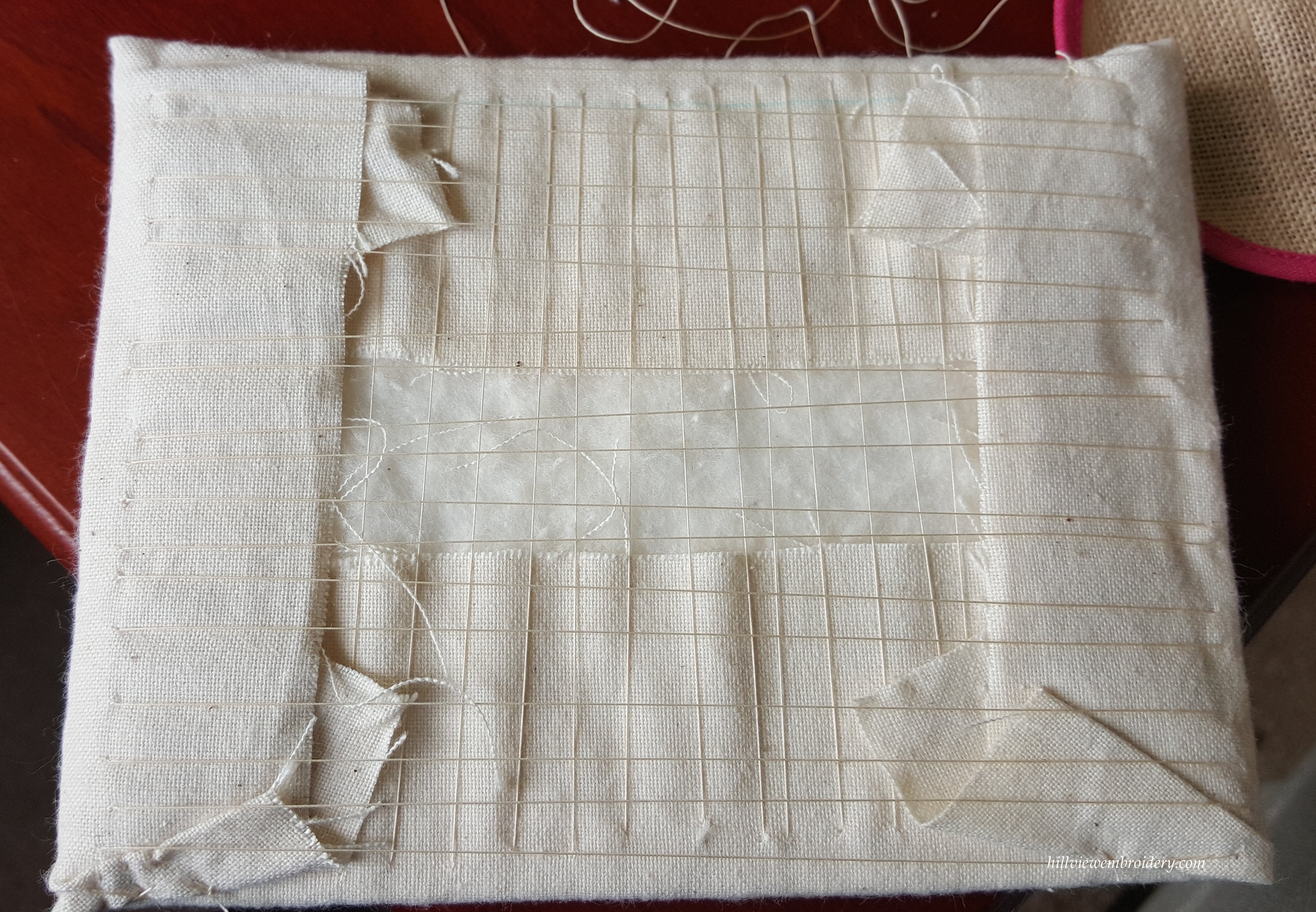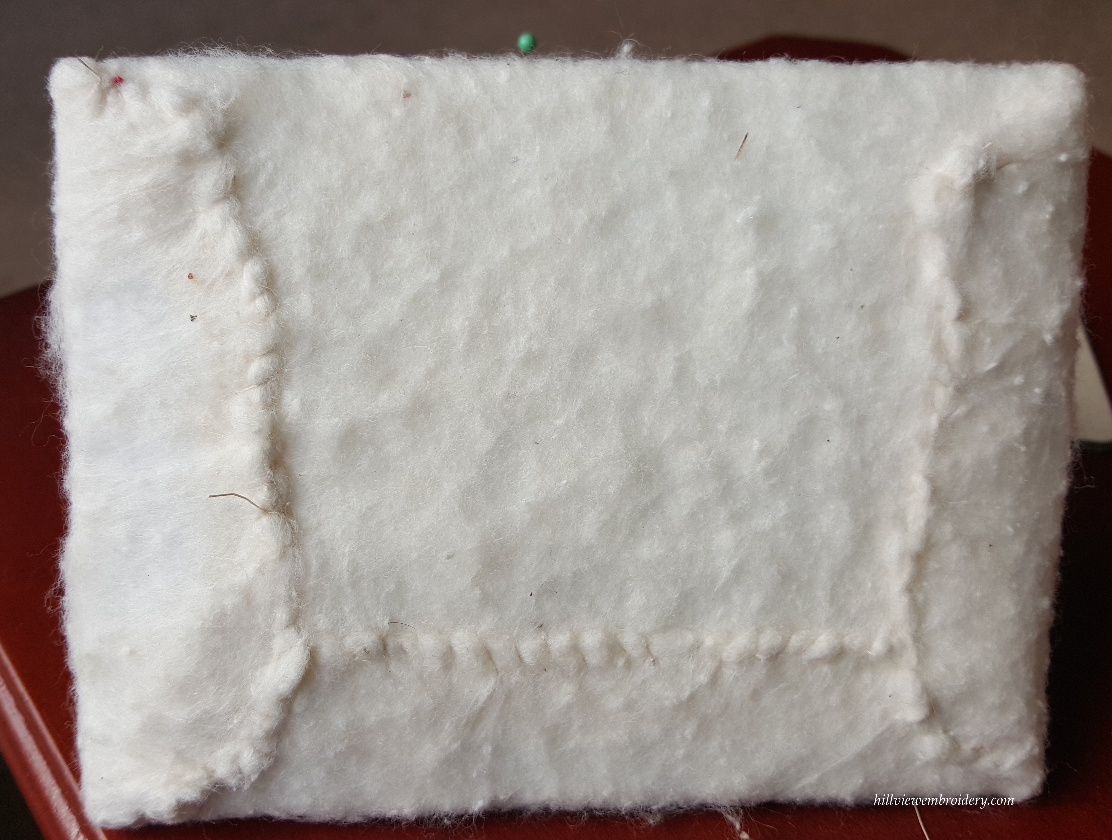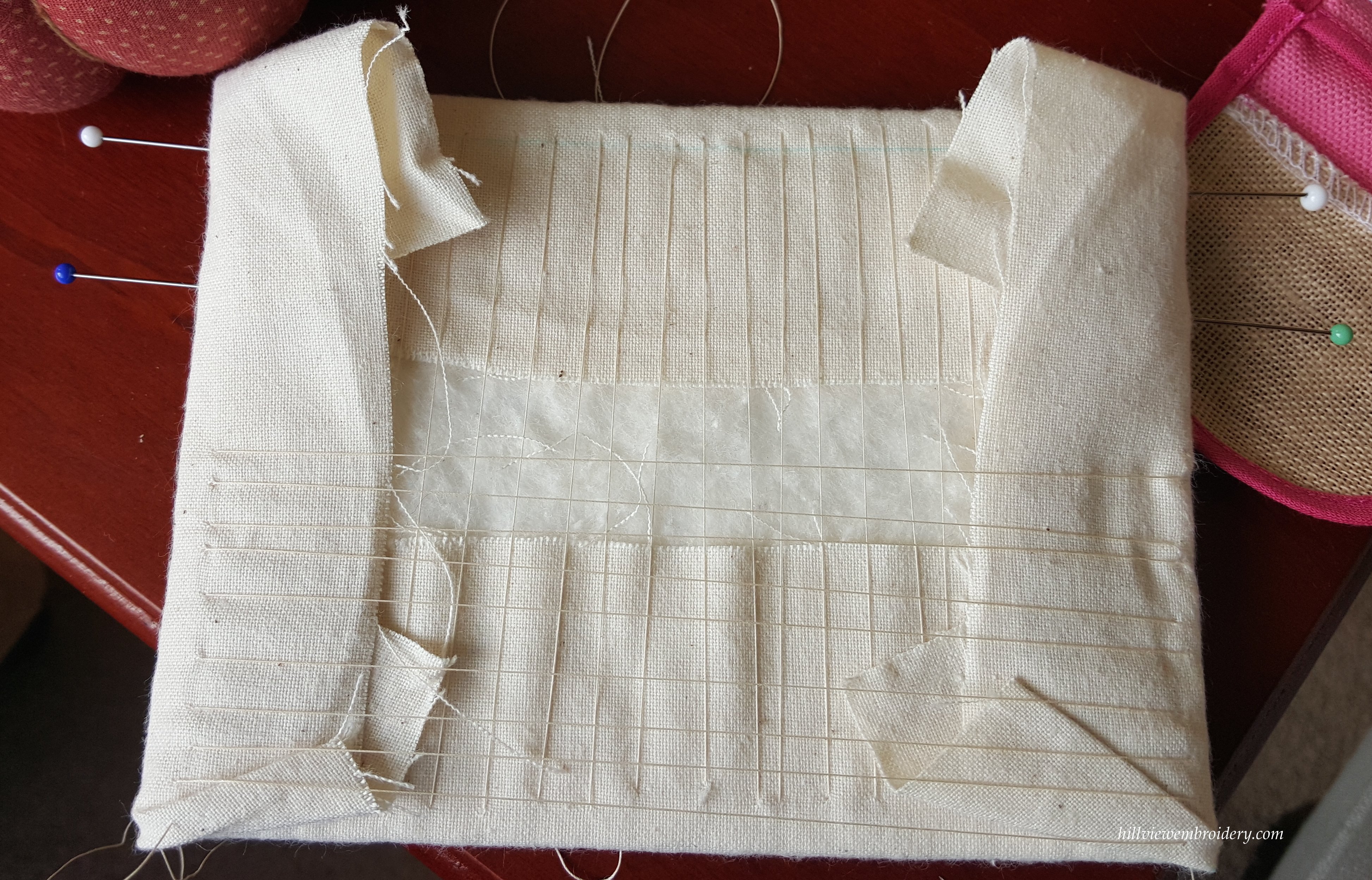 I didn’t know from the outset if I would need to pad the board further or not, but after ‘playing’ with the finished piece on the board, I came to the conclusion that this would probably be a good idea. I have a rather large supply of wadding given I never use it, so I put that to good use. The next part is where a bit of experience would have been useful! I didn’t know what size to cut the wadding to. My initial thought was that it should be marginally smaller, and I’d use some fabric glue to keep it in place. But after ‘testing’ this theory by placing the finished piece on the board with the wadding, I decided that wasn’t quite right. Next thought – the wadding needed to completely cover the front of the board. That didn’t seem to work either. So, that left cover the entire board with the wadding! I cut it marginally larger so I didn’t waste too much more of the wadding with all my playing around, and that seemed to work! Well, my somewhat hasty ‘test’ suggested that it would be ok. So I tacked that in place (with thread, not glue!).