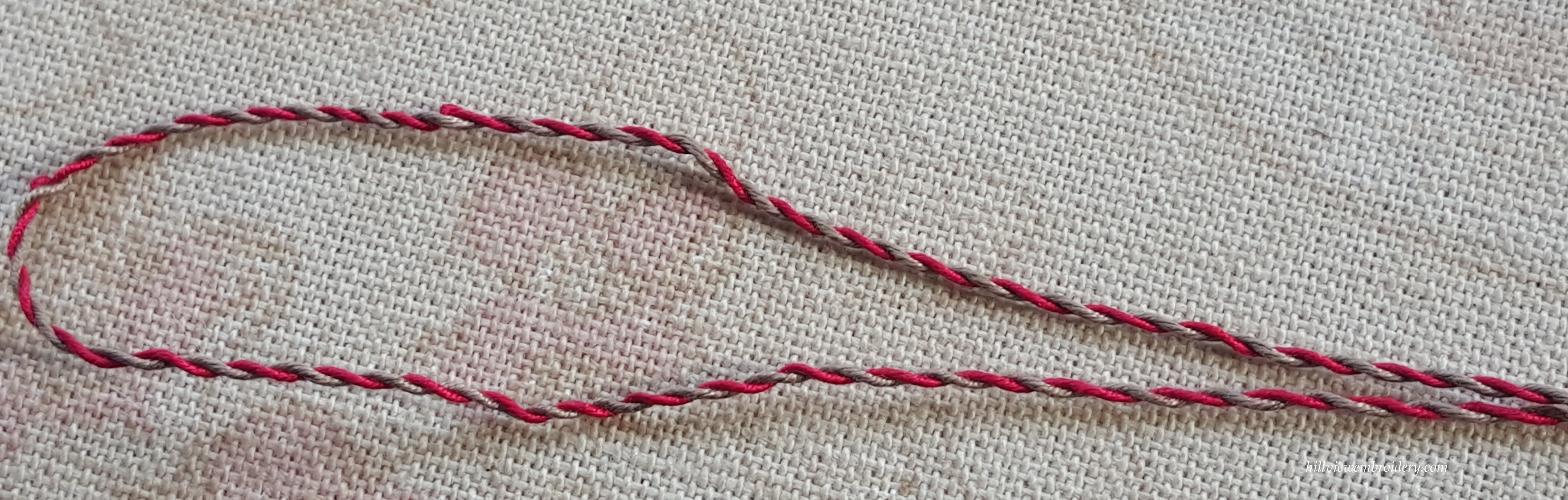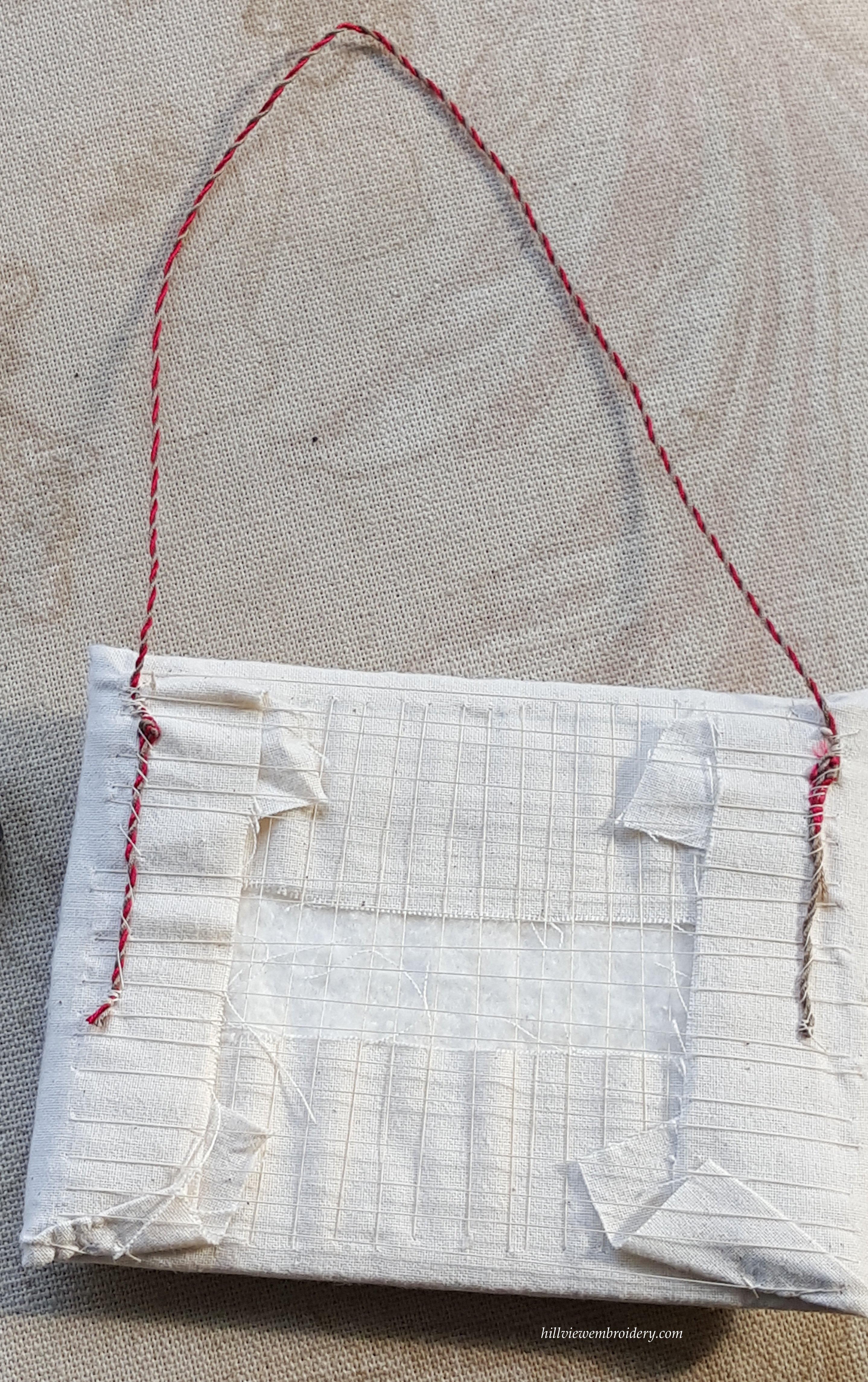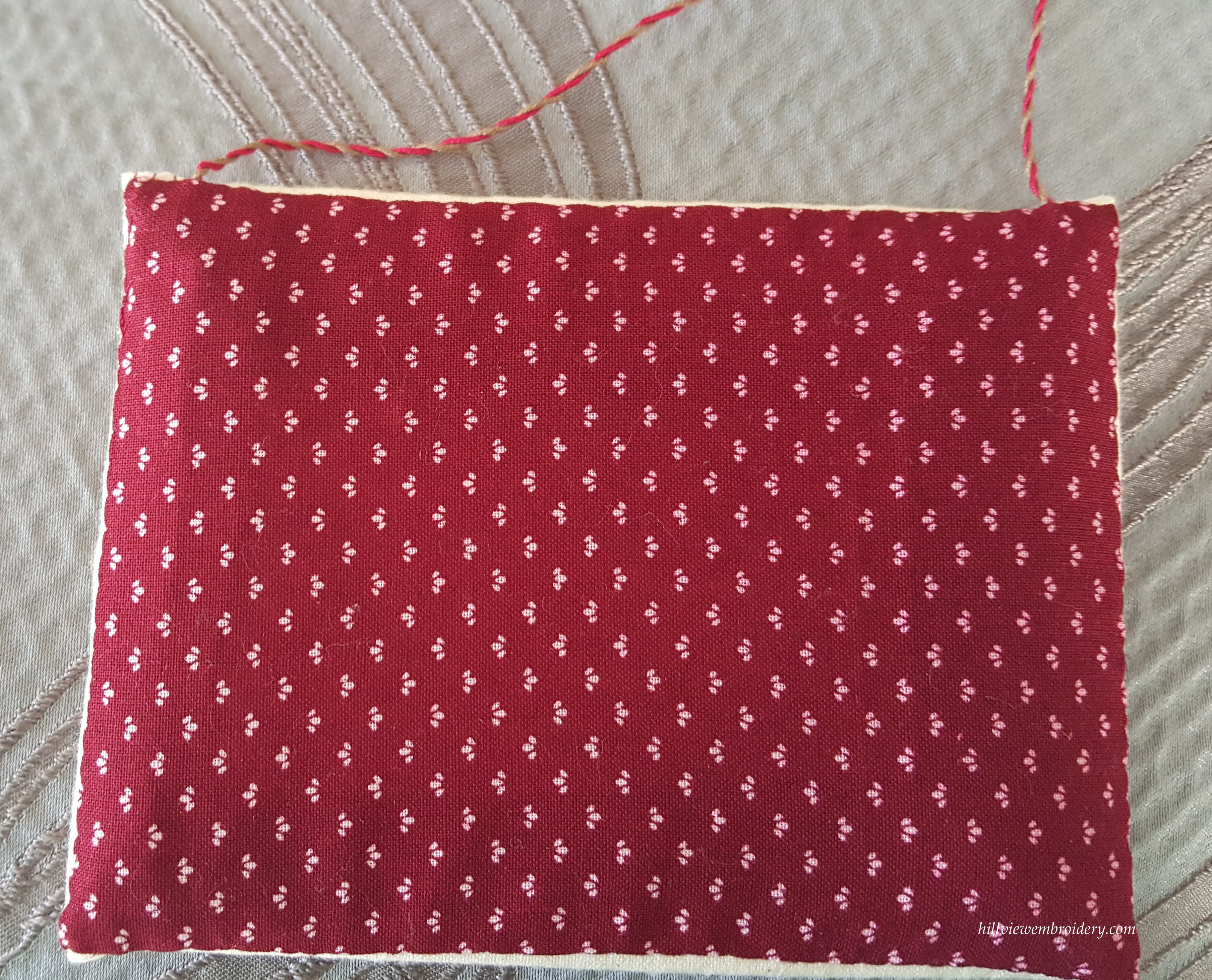 Then the fun part! Making the cord. I chose two colours of DMC thread, and using six strands of both colours, I made a rope, which I then stitched into place so I could ‘hang’ my plaque. Not too much breath holding, although it does get tricky at times and I got myself into only a minor tangle this time round! You’ll have to excuse the odd photo – it was rather tricky to take without getting into a complete tangle!