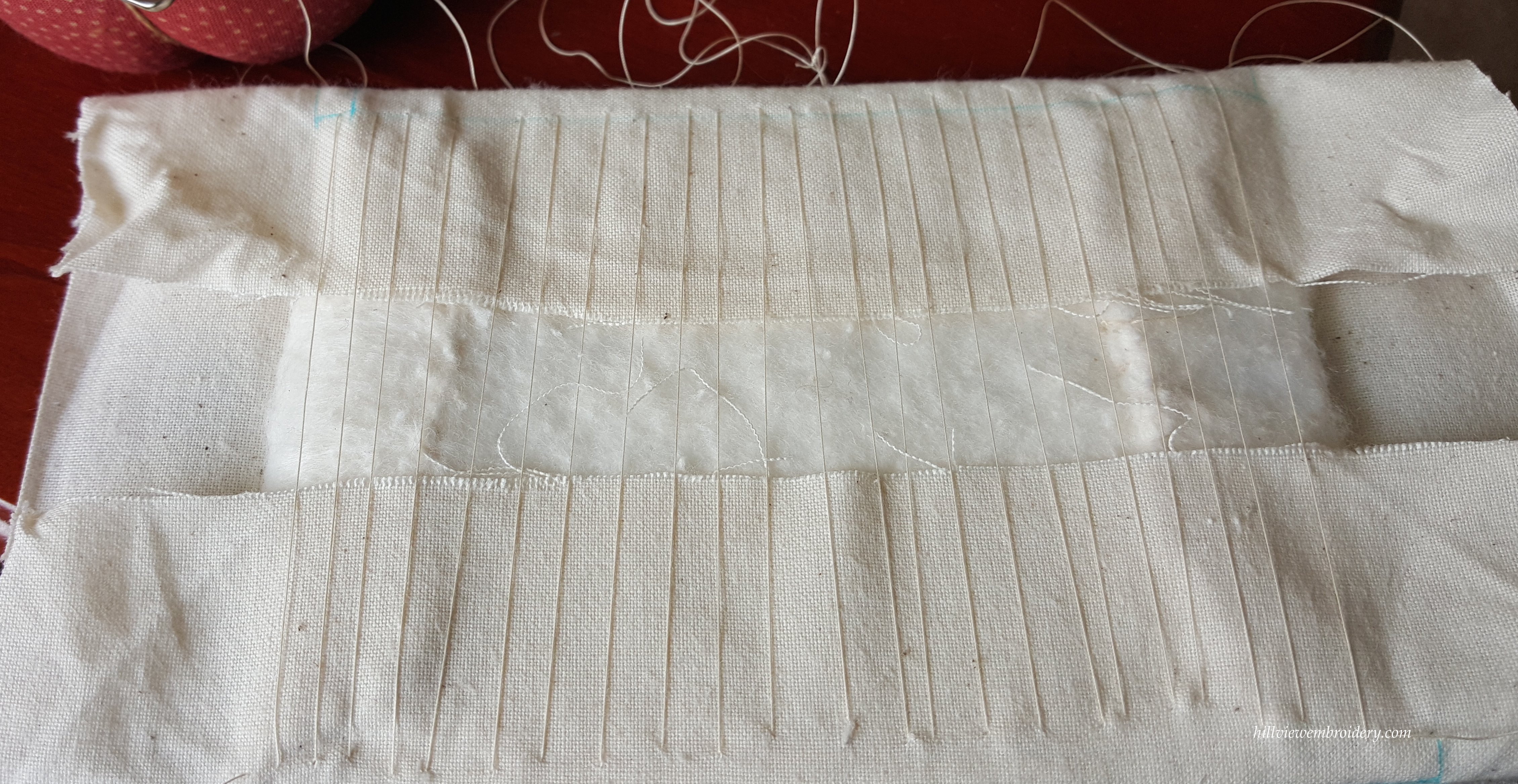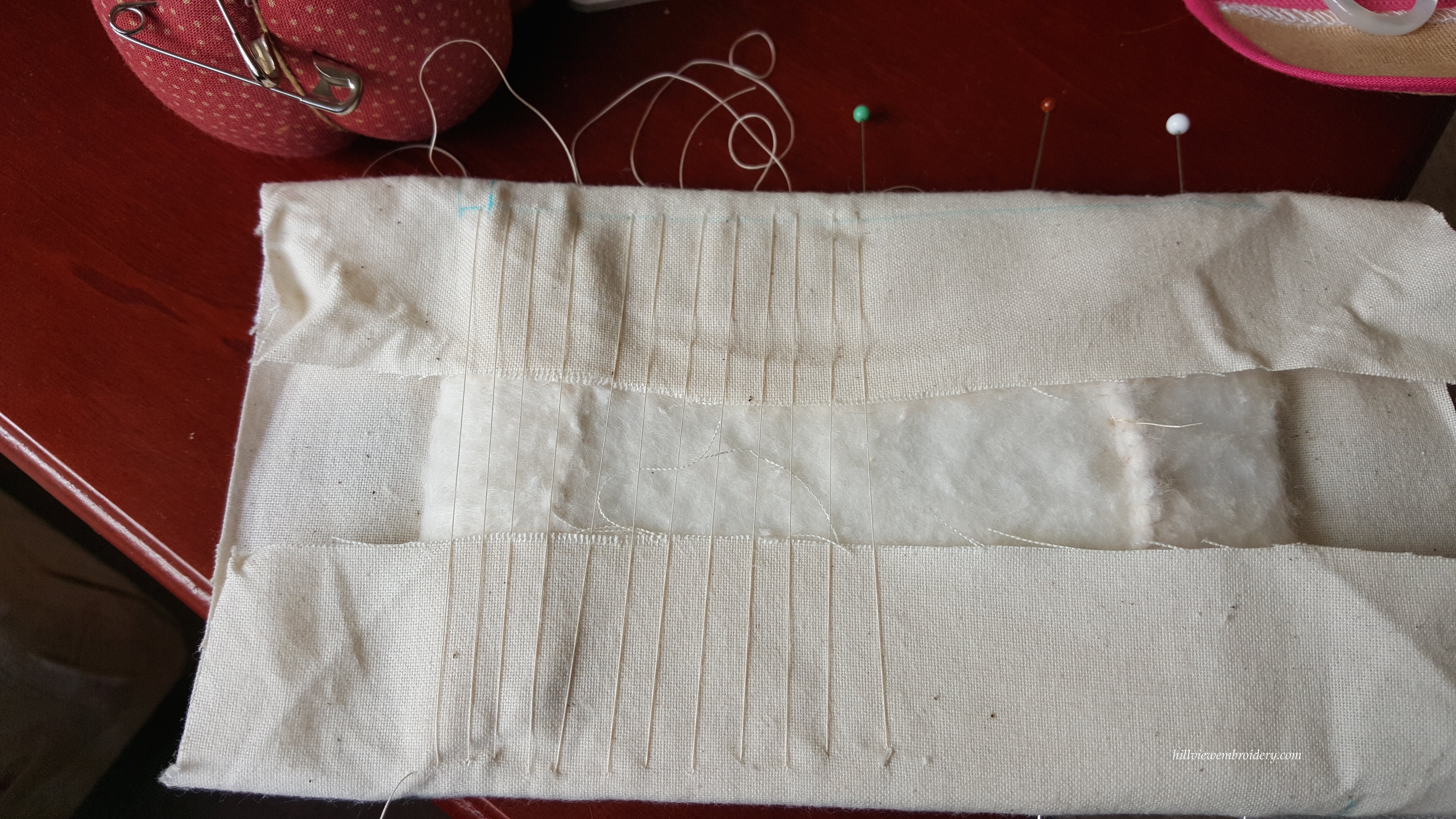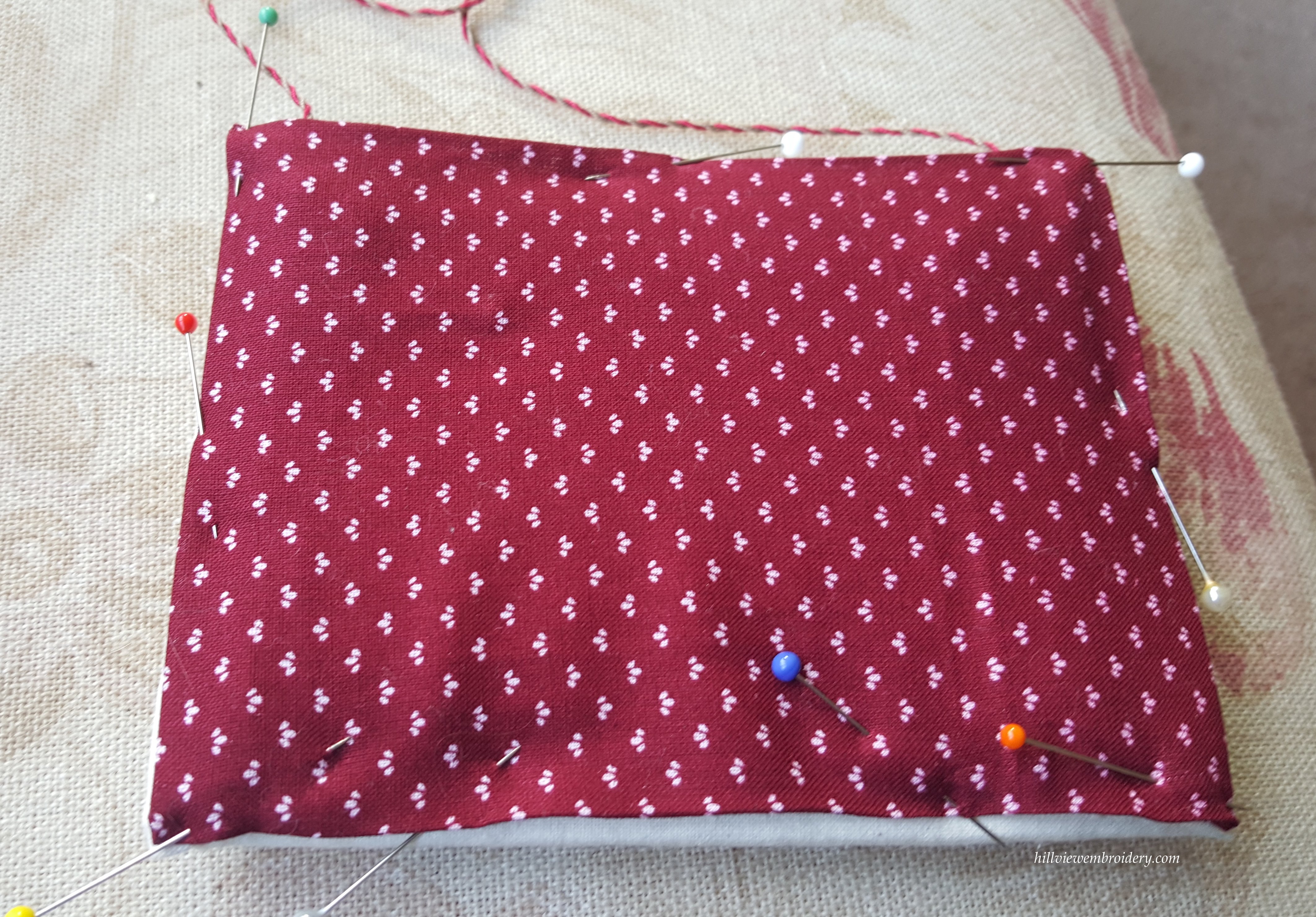 After choosing the backing fabric, and admitting to myself that I really did need to iron the fabric and the hem into place, I stitched the backing fabric on. I can feel the lacing threads through this fabric, so if I were to do it again, I would probably use some felt or more wadding just to ‘firm up’ the back a little.