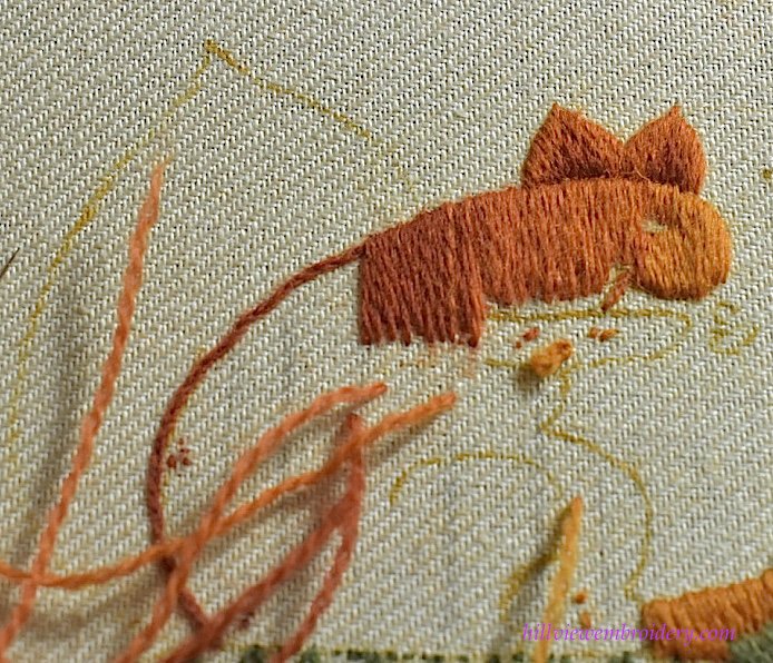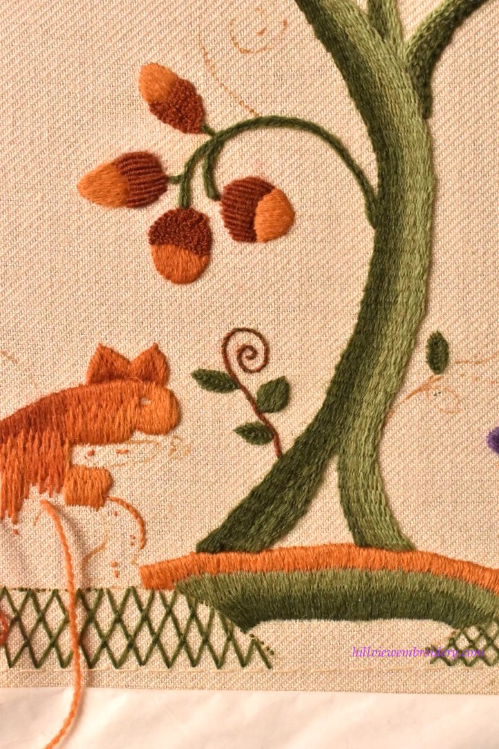 That was a complete feast for the eyes and so pleased to see how well the squirrel is coming along. I was thinking chain stitch for the tail but then saw your finished acorns and wondered whether french knots would give you the texture you’re looking for?