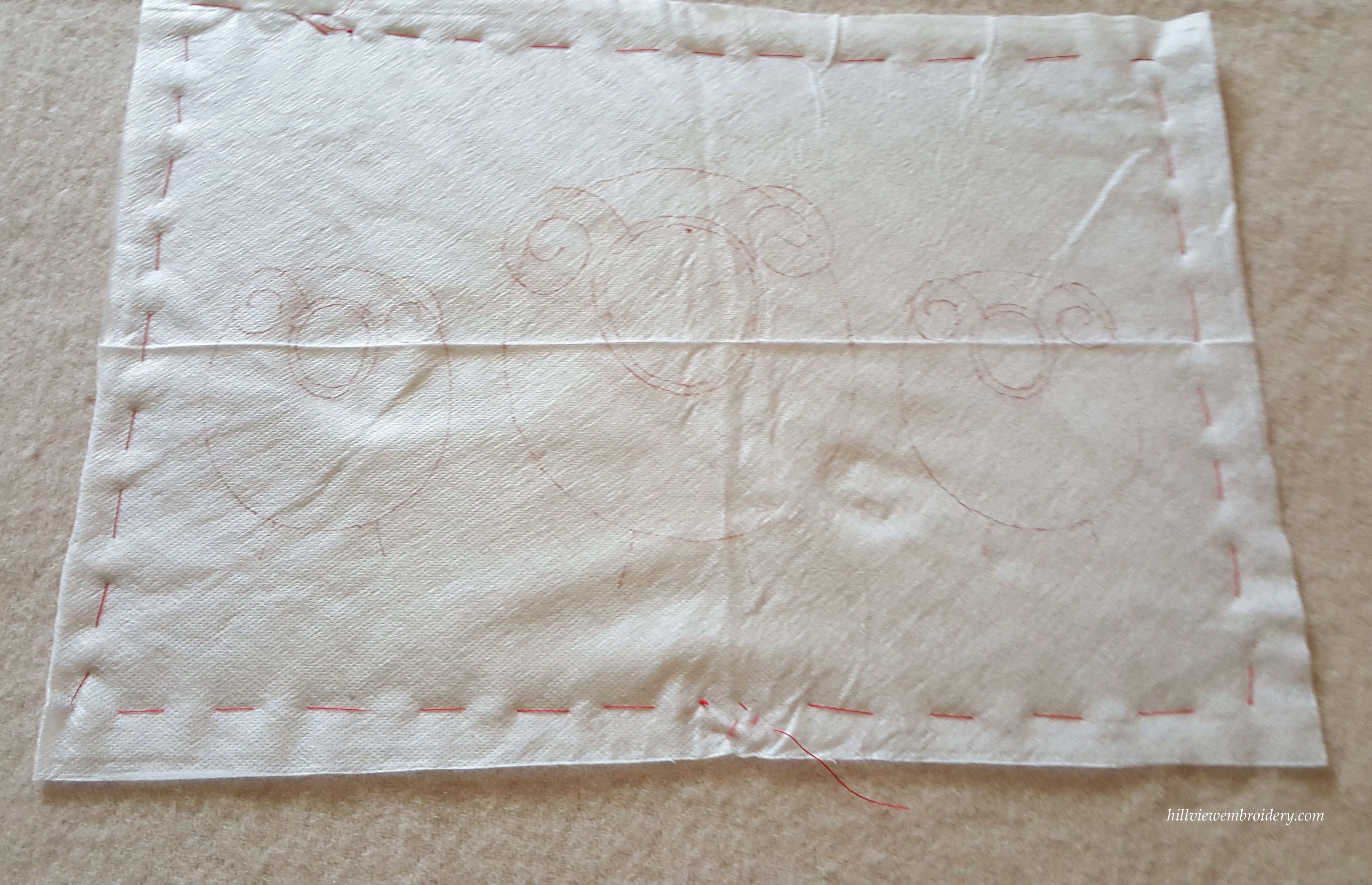Once the required fabric had been located, it was time to transfer the design. For this, I used solvy, a water soluble material, which feels a lot like interfacing. I know some people love it, and others won’t go near it, so this could open up some debate! However, when transferring onto blanketing, I find this the easiest, most accurate method for me. I don’t tend to use it for anything else except wool blanketing! I know another method that is commonly used when using a fabric such as blanketing is to tack it into place. This probably would have been a good simple design to try that method, but anyway! As you need to drench the completed work in water to remove the solvy, you need to be very confident that your produced products are washable, but as its a baby blanket, my theory is it will likely have far worse than a lot of water on it!