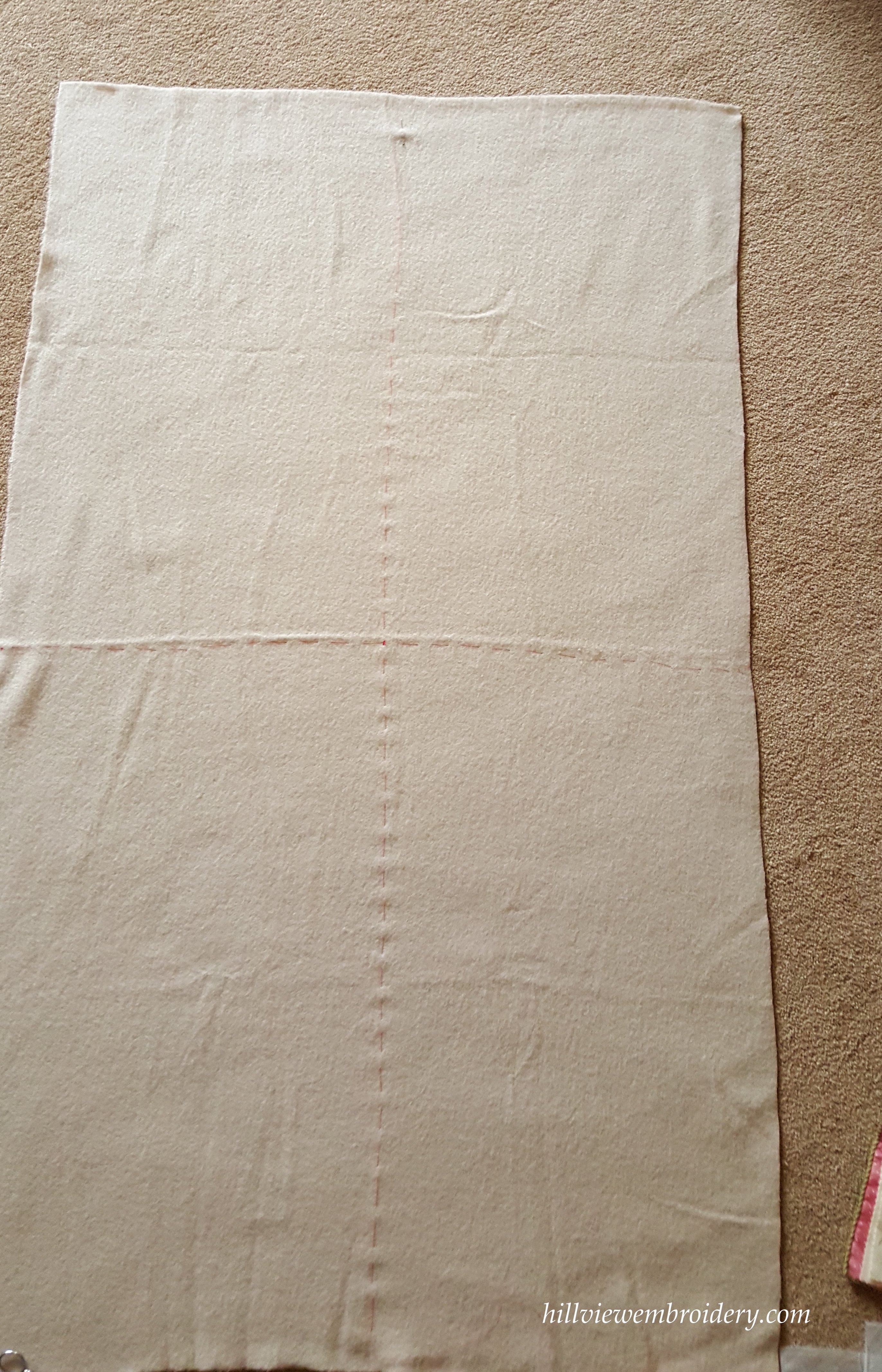 To position the design, I found the centre by tacking the centre in both directions. I then used this as a guide to find the bottom one third of the design, with the centre tacking line used to centre the middle of the three sheep.