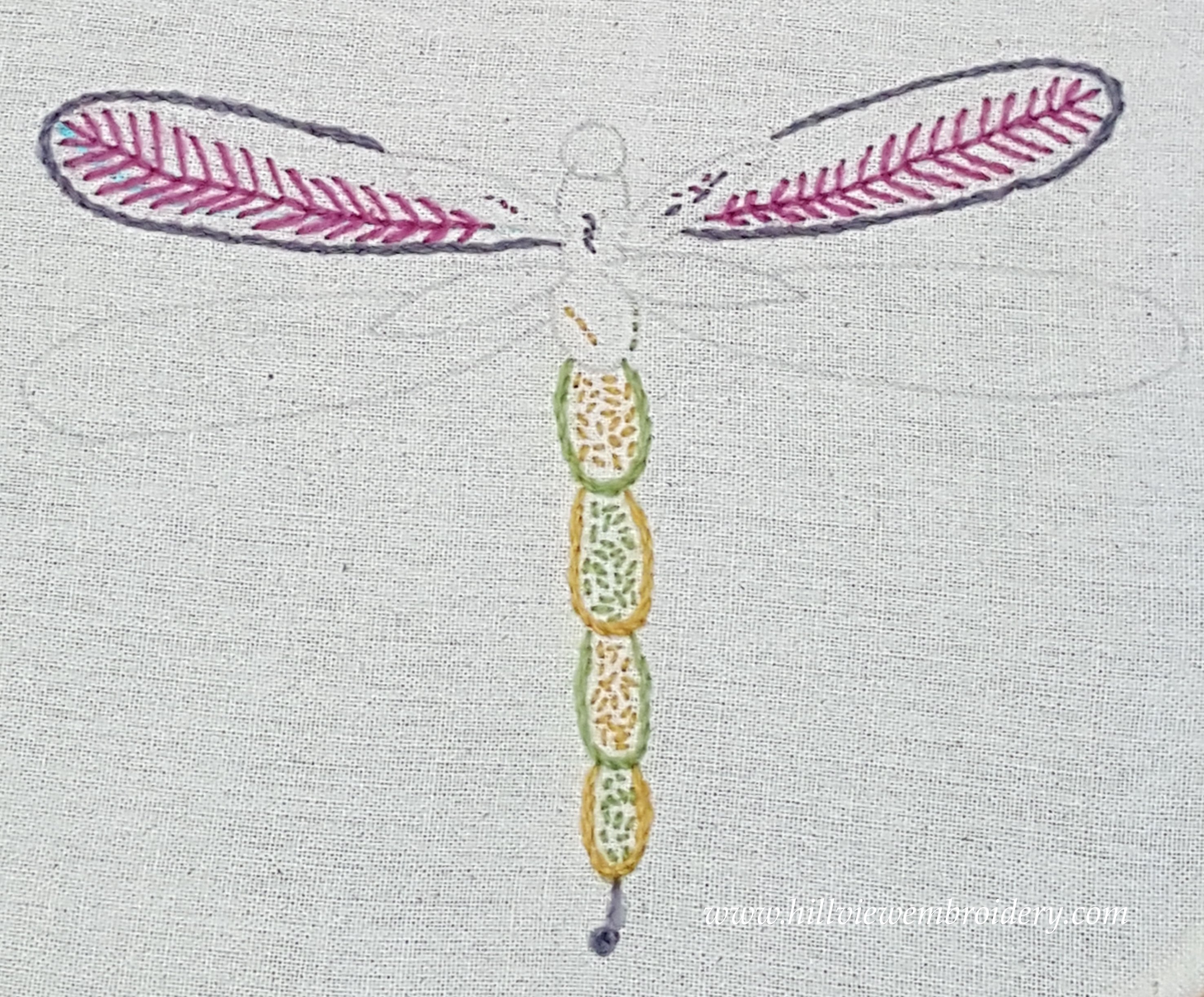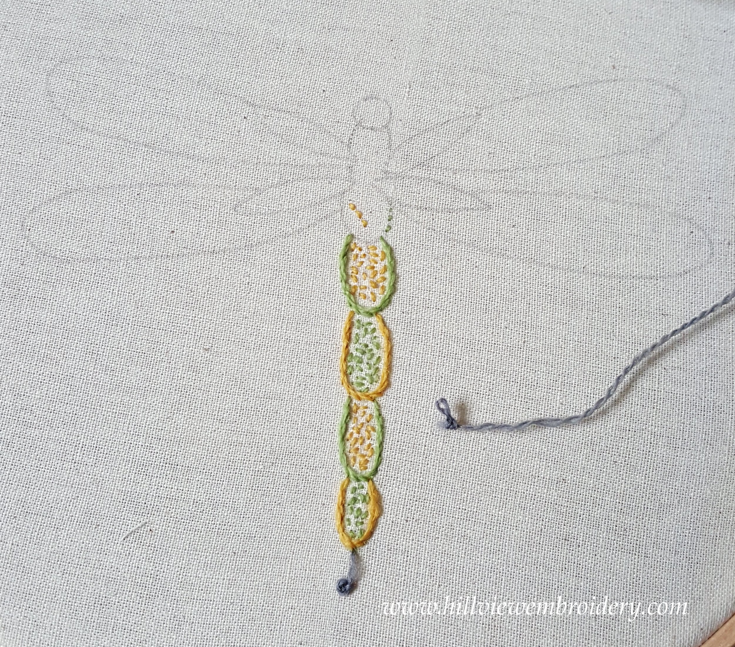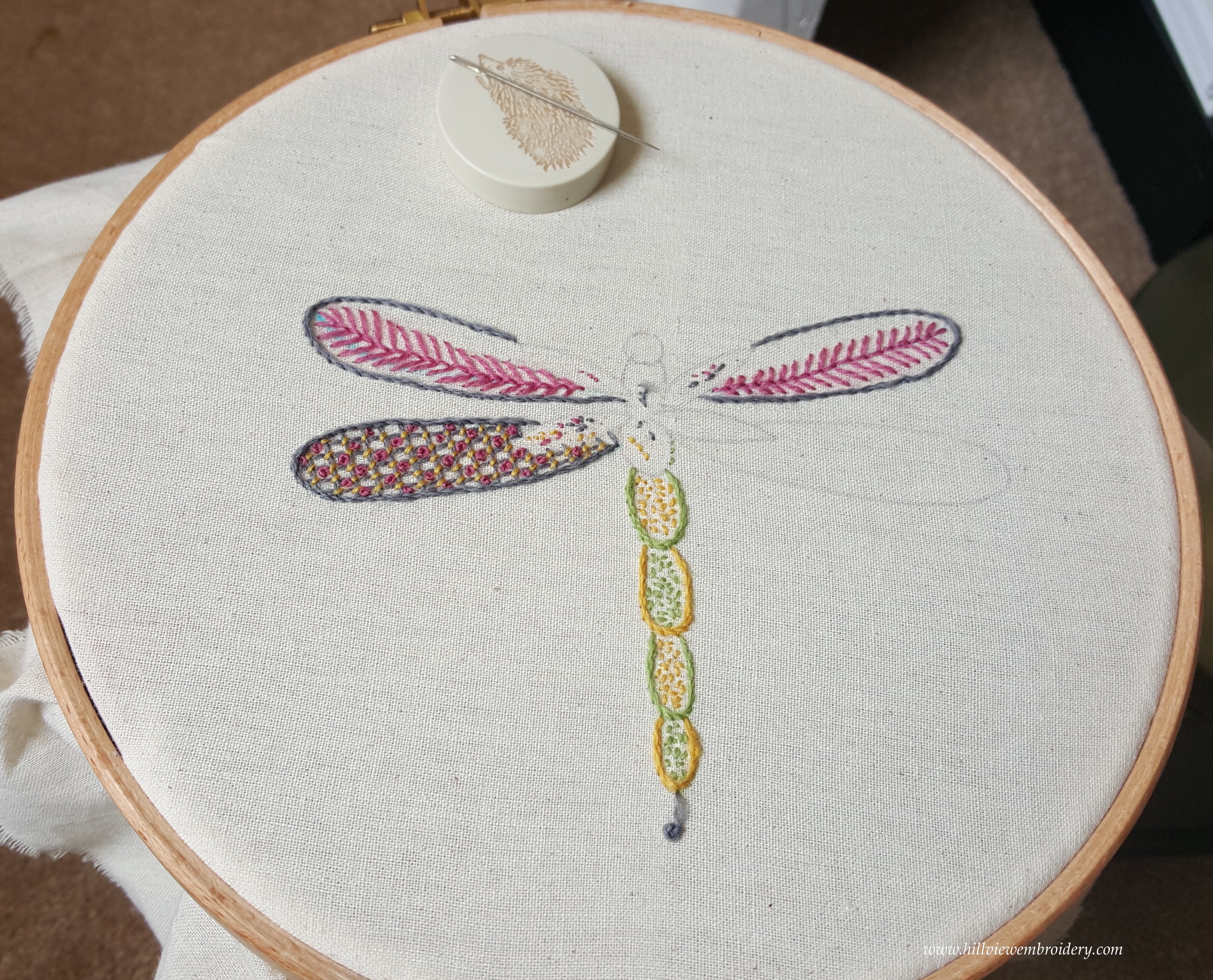 Now, because apparently one quick project wasn’t enough, I really wanted to do another one. I seem to also have an obsession for crewel work presently, so I got out another little kit, this one a dragonfly by Sophie Long. I’m hoping to finishing him off this afternoon, and I’m again really enjoying this one. I’ve changed all the split stitch outlines to stem stitch, just because I like stem stitch! I’m also using this as a bit of a testing ground for stitching with ‘two hands’. Sounds a bit strange, as I usually do stitch with both my hands, but I’m trying to stitch with my left hand always on the top, and my right always on the bottom of the frame (I’m using a seat frame, which makes this experimentation possible!). I can definitely see how this would be a quicker way stitching, though my left hand is struggling with the accuracy of stitch placement, so more practice is required! It’s probably good in general to get my left hand a bit more nimble! I also think I’ve popped too many rows in my lattice stitch, but it’s been a good way of working on some of these techniques.