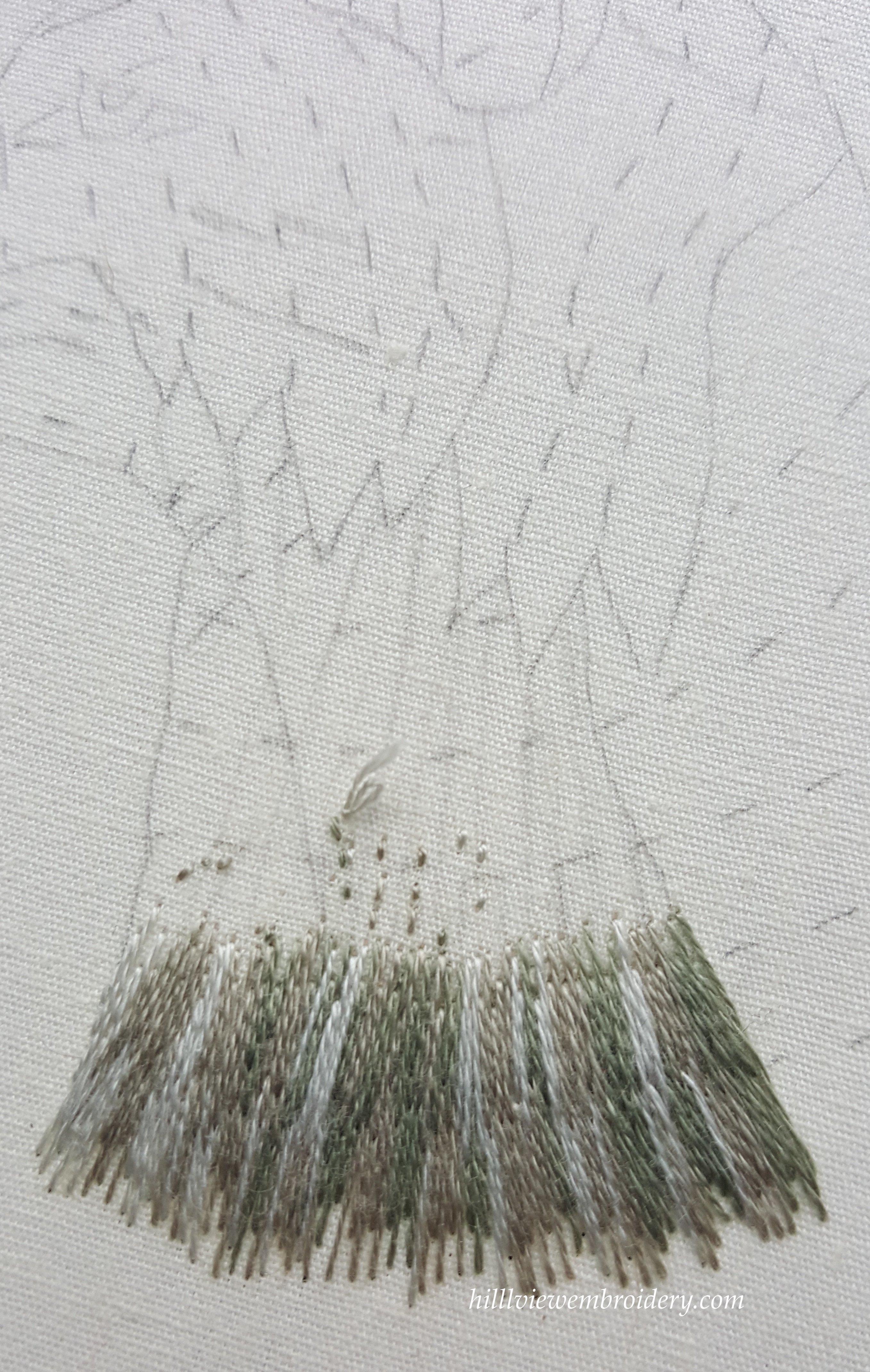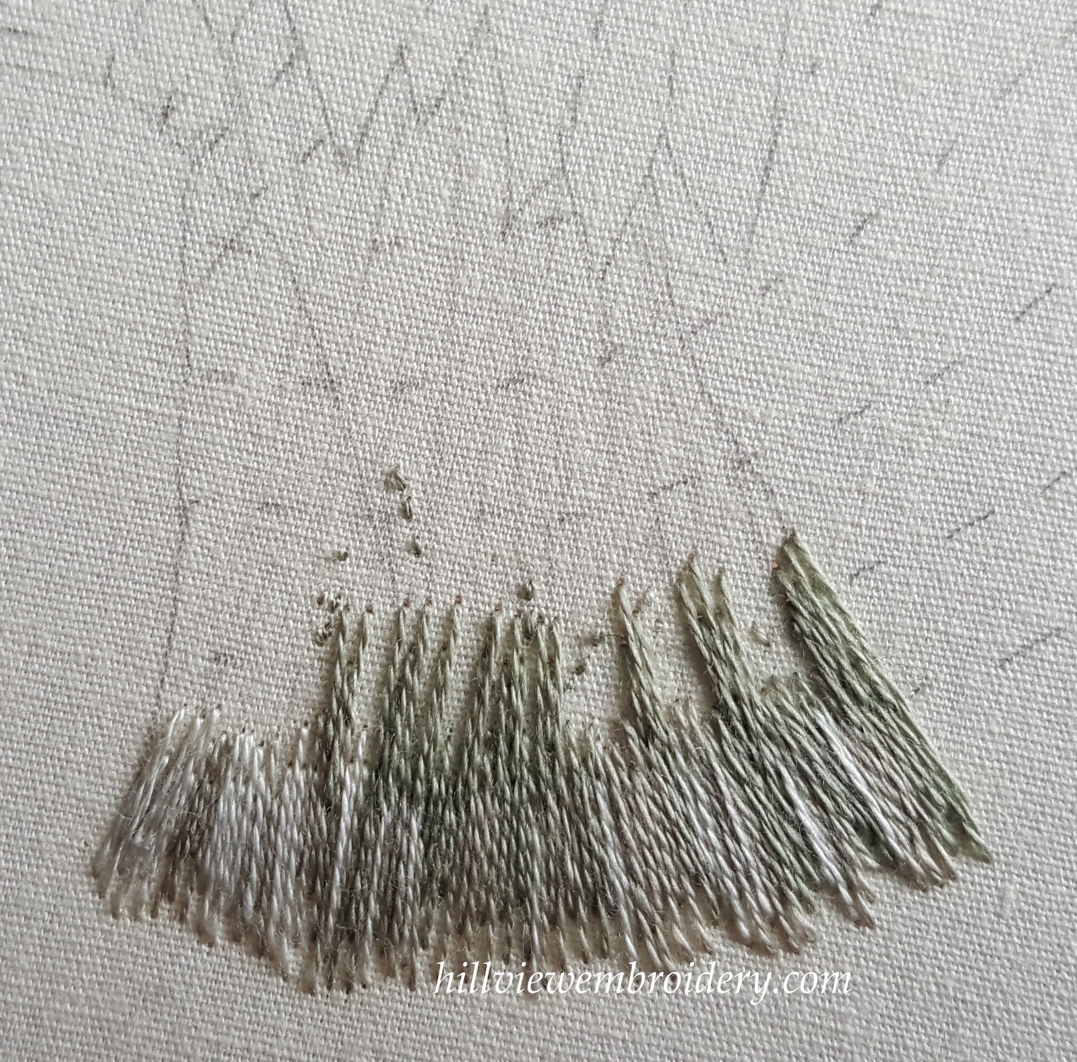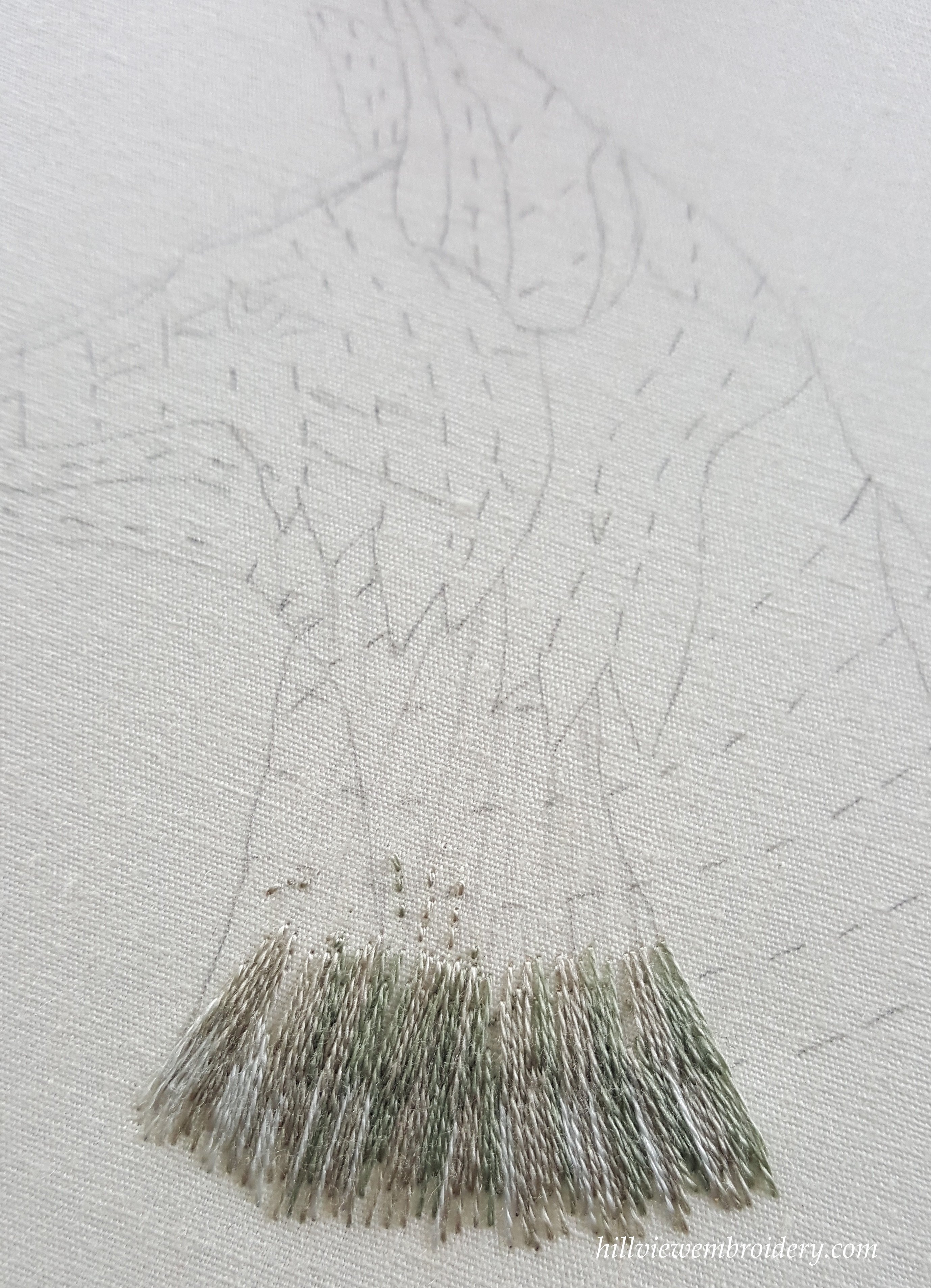 I have just sent my second row off for critique. I feel I went a little off course with my direction lines in the middle of the second row, and I found that I hadn’t quite packed enough stitches into the first row. This must be the first time this has ever happened to me! About half way through the second row, the concept of the long and short stitch finally dropped – each stitch is (roughly) the same length – it is each stitches starting point that varies and gives this stitch its name. I think in every other piece of needle painting I have done before, my stitch lengths have been rather random, whereas this is very methodical and ordered, and I am only now seeing the benefit of this! I’m hoping this week I will be able to get a few rows done, so more on that and the feedback I get next weekend.