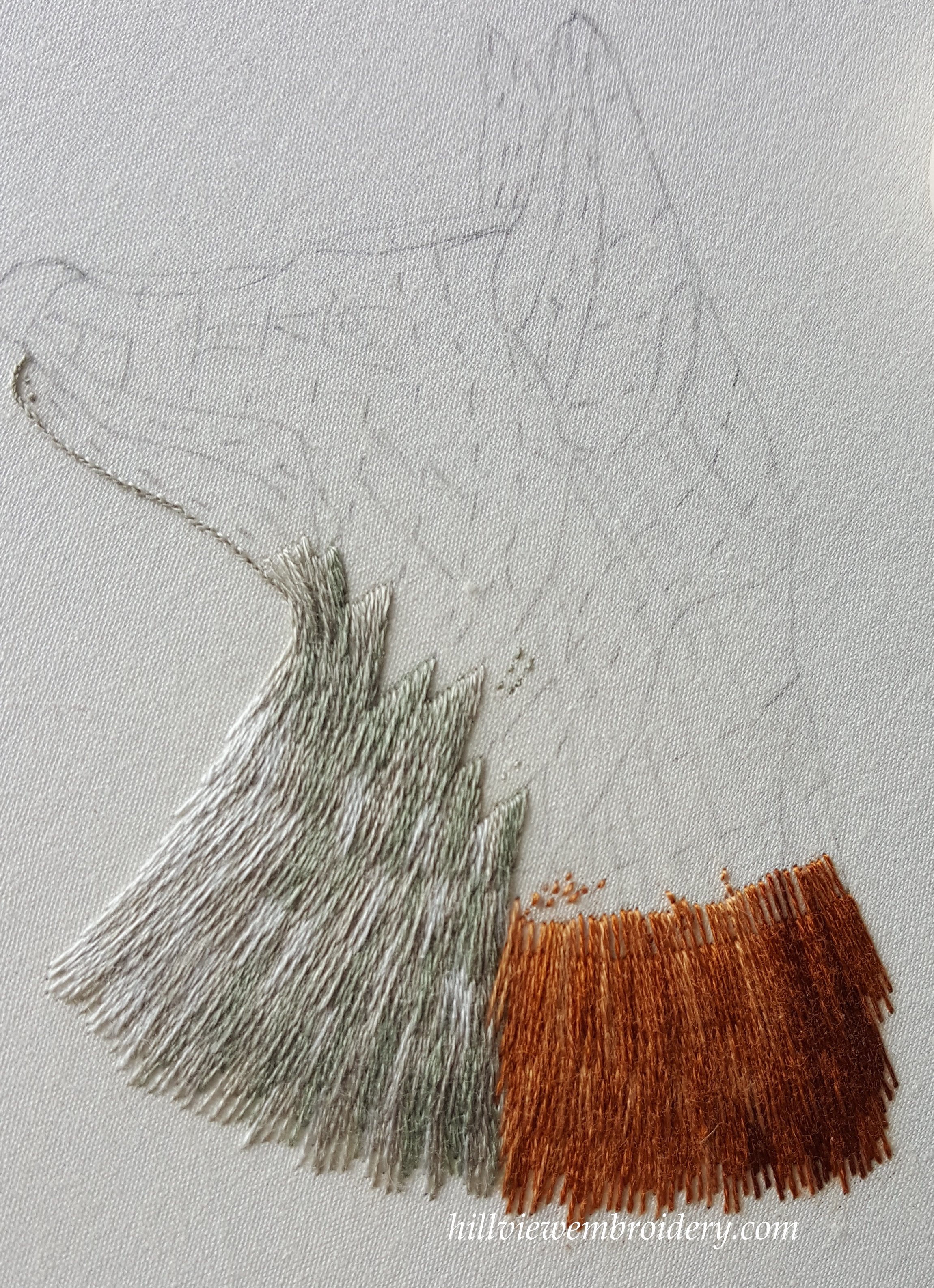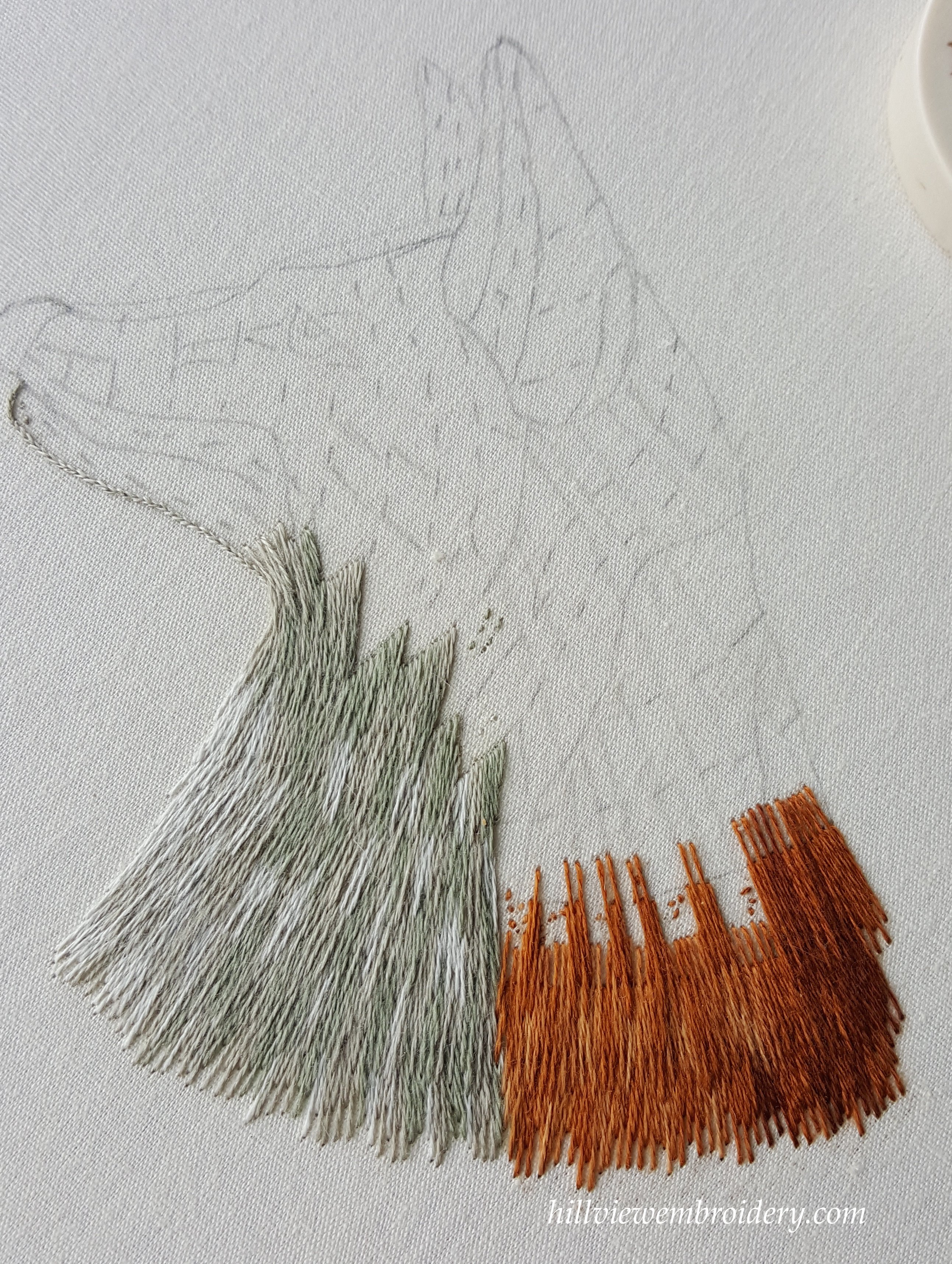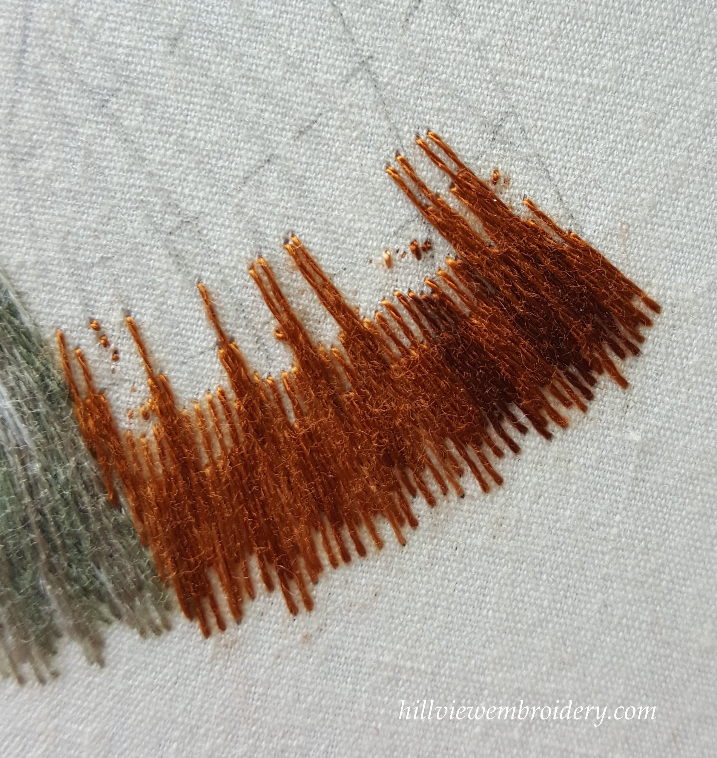 My first attempt at stitching the browns I pulled out before I even bothered sending it off for critique. I wasn’t at all happy with it – compared with the greys, the first row was too long, and looked out of place. My stitch direction lines were a little off as well. Throughout this whole section to date, I have actually found the stitch direction to be a little difficult. And I thought it was going to be straight forward! I was so frustrated I forgot to take a picture, but you can see in the photos the marks of the original thread, and just how long they were. Does anyone have ideas on how I can ‘eliminate’ these marks? They are fading with time, but I’m not sure they will ever ‘disappear’.