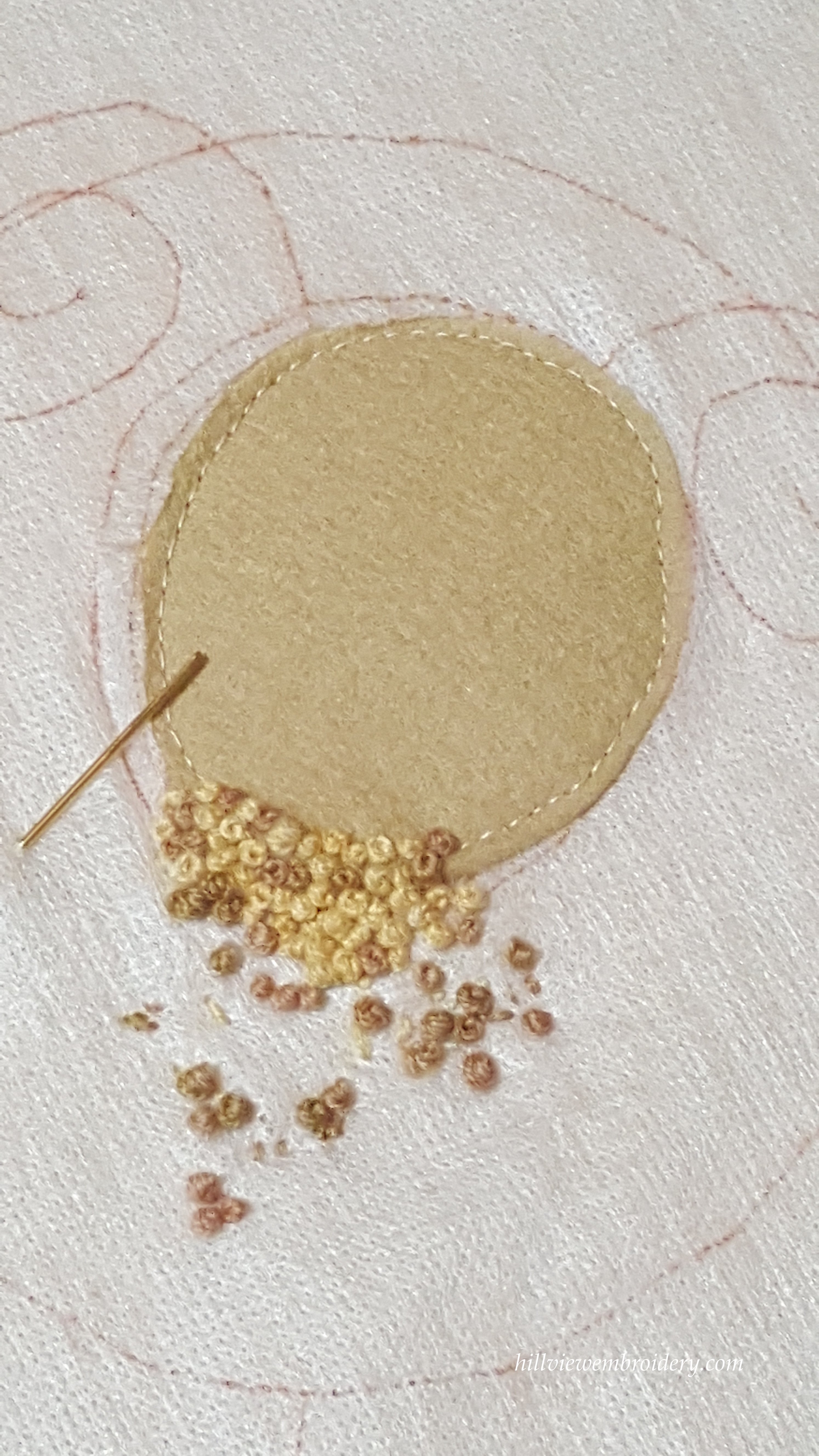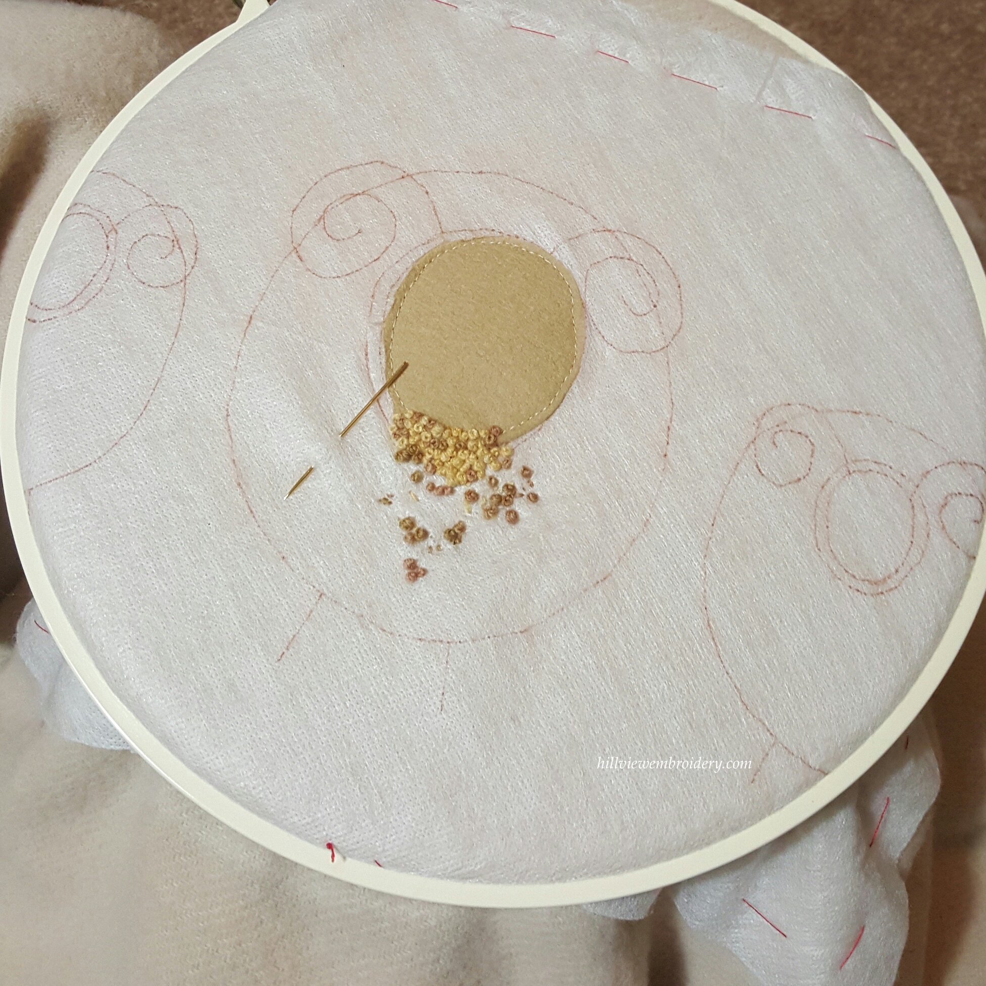 And on my slightly more ‘urgent’ project of the baby blanket (baby is due next week!!!), I have put in a grand total of about half an hour, which has left me with a very odd looking ‘thing’ (not a sheep just yet!). I used fusible web on the felt, which made stitching the felt onto the background nice and straight forward, and I am currently playing around with the colours I have chosen, as well as the number of wraps for each knot. I have decided on using three strands of the Gloriana wool, and anywhere from two to four wraps at this stage. I will also start blending the different colours in the needle soon. So all a bit of fun, I just need to get moving with it! I am loving the feel of this woollen thread – so soft and luxurious, a real treat to stitch with!