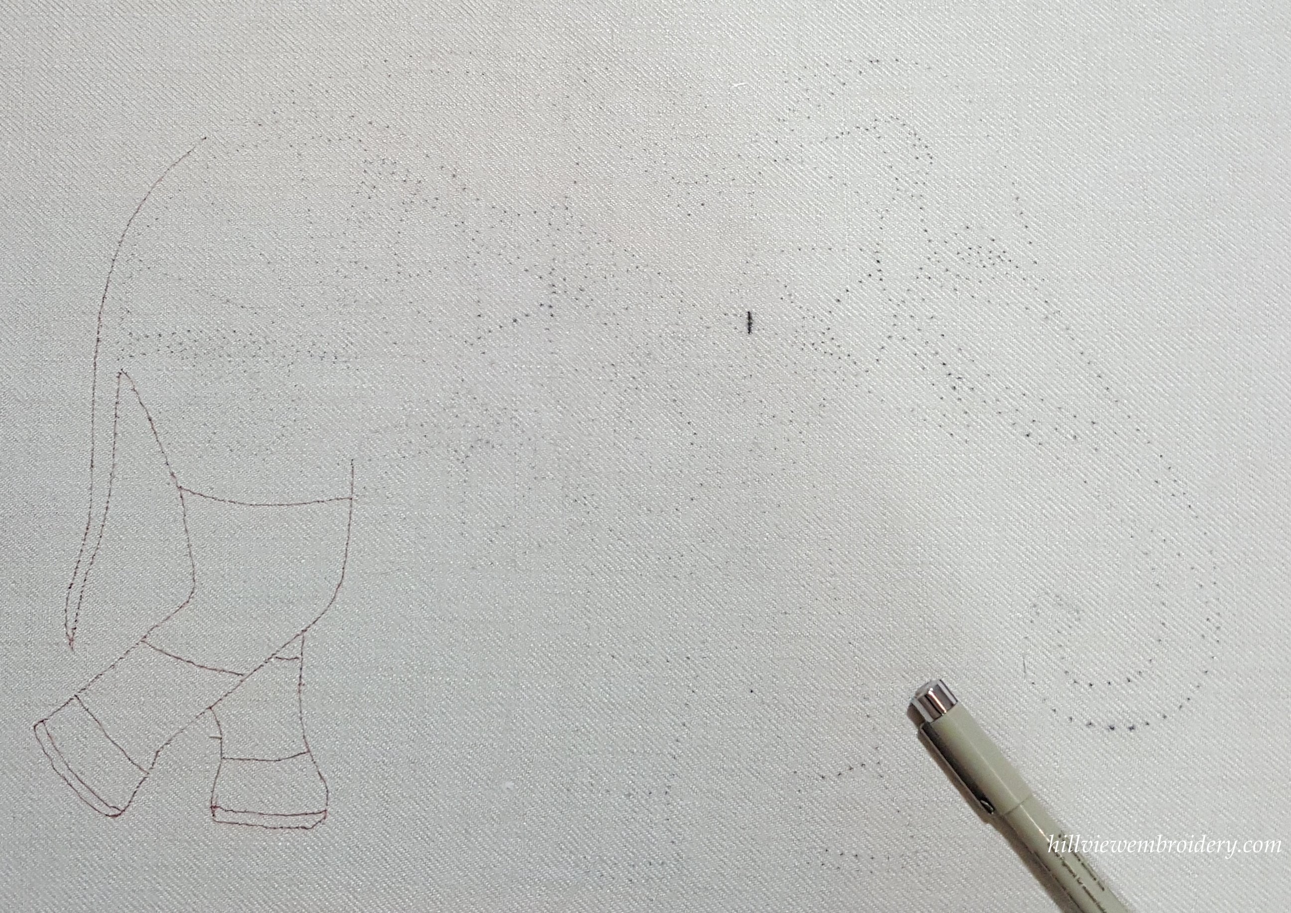 As you can see, there is a lot going on in this picture, way too many lines for me to trace onto the fabric for stitching over, especially since I don’t have any real idea where I’m going to end up with this design. My next step was to work out just how much of the original design I would use. As I’d gone through the design and worked out a few ideas for stitches, I had an idea of what I wanted my design to look like. So I traced that part of the picture that I feel gives me good balance between being a little ‘structured’ whilst also giving me enough freedom to play with the stitches each week. Let’s hope so anyway!
