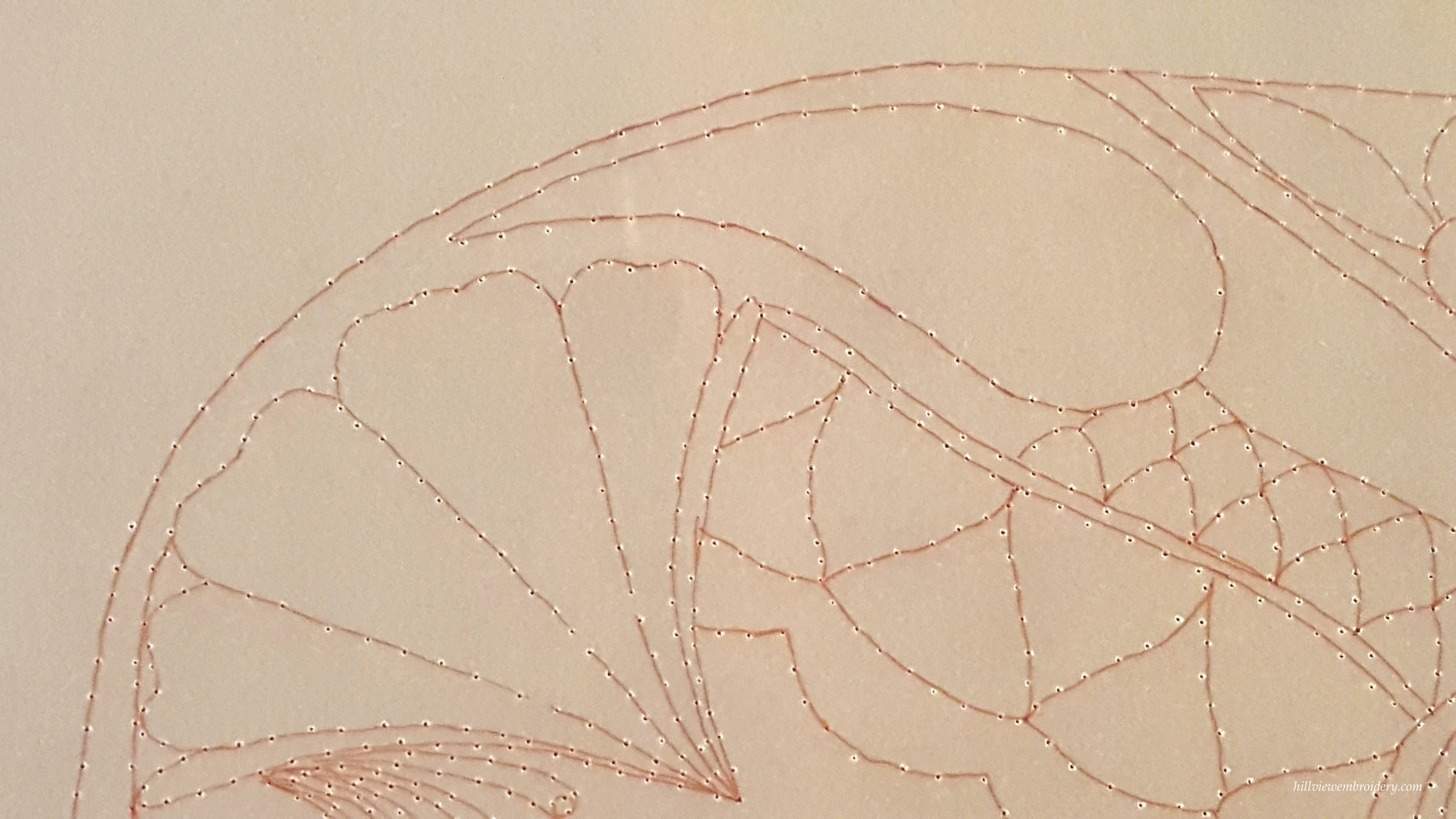 As part of wanting to really learn a few things through this process, I decided to give the prick and pounce transfer method another go. I’d attempted this method once before, when attempting to trace the design for the Trevelyon Cap Course, but one thing I learnt through that, was that prick and pounce doesn’t work (for me anyway), with a lot of really intricate lines, I just ended up with black dots everywhere that meant nothing! (Any guidance or suggestions on this would be great!). The process was slightly more successful this time round, although as you can see from the photo, the right hand side of the design was much easier to make out than the left. So still some learning and experimenting with this transfer method required. But this does mean that in the event I want to use this pattern again, it will be very easy to transfer, as over half the work is completed! I used a mid-weight vellum, and taped two A4 pieces together to get the size I needed. Overall I’m reasonably happy with how it worked out. A few wobbly lines, but hopefully I can cover them up in the stitching process.