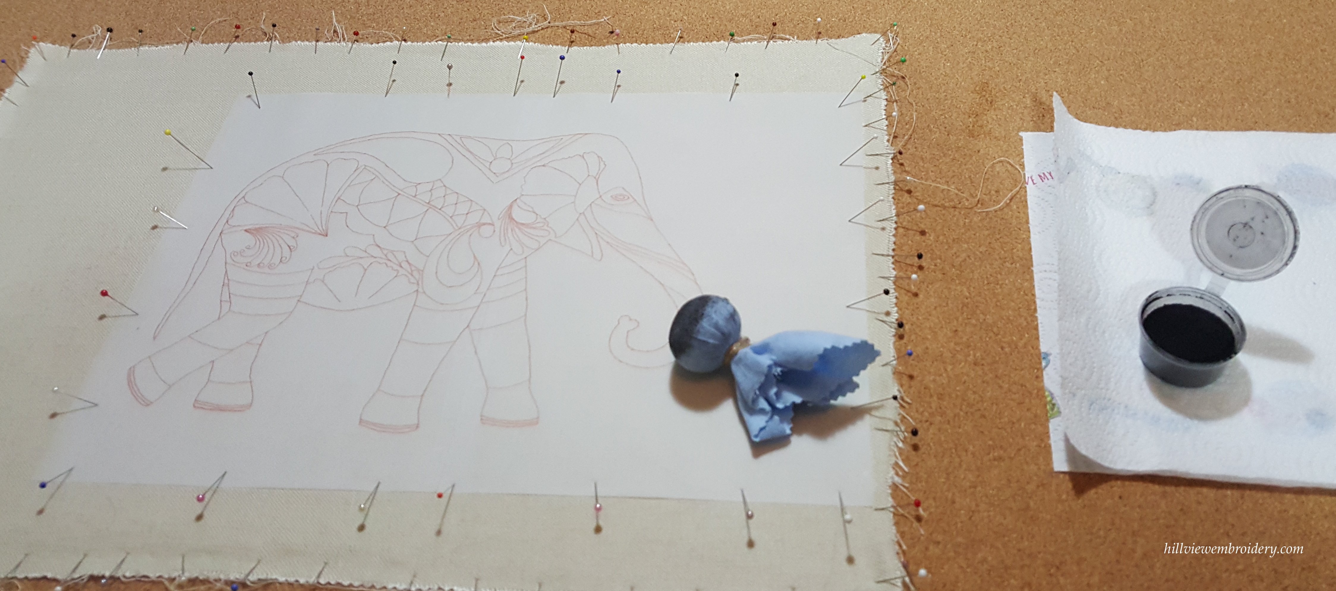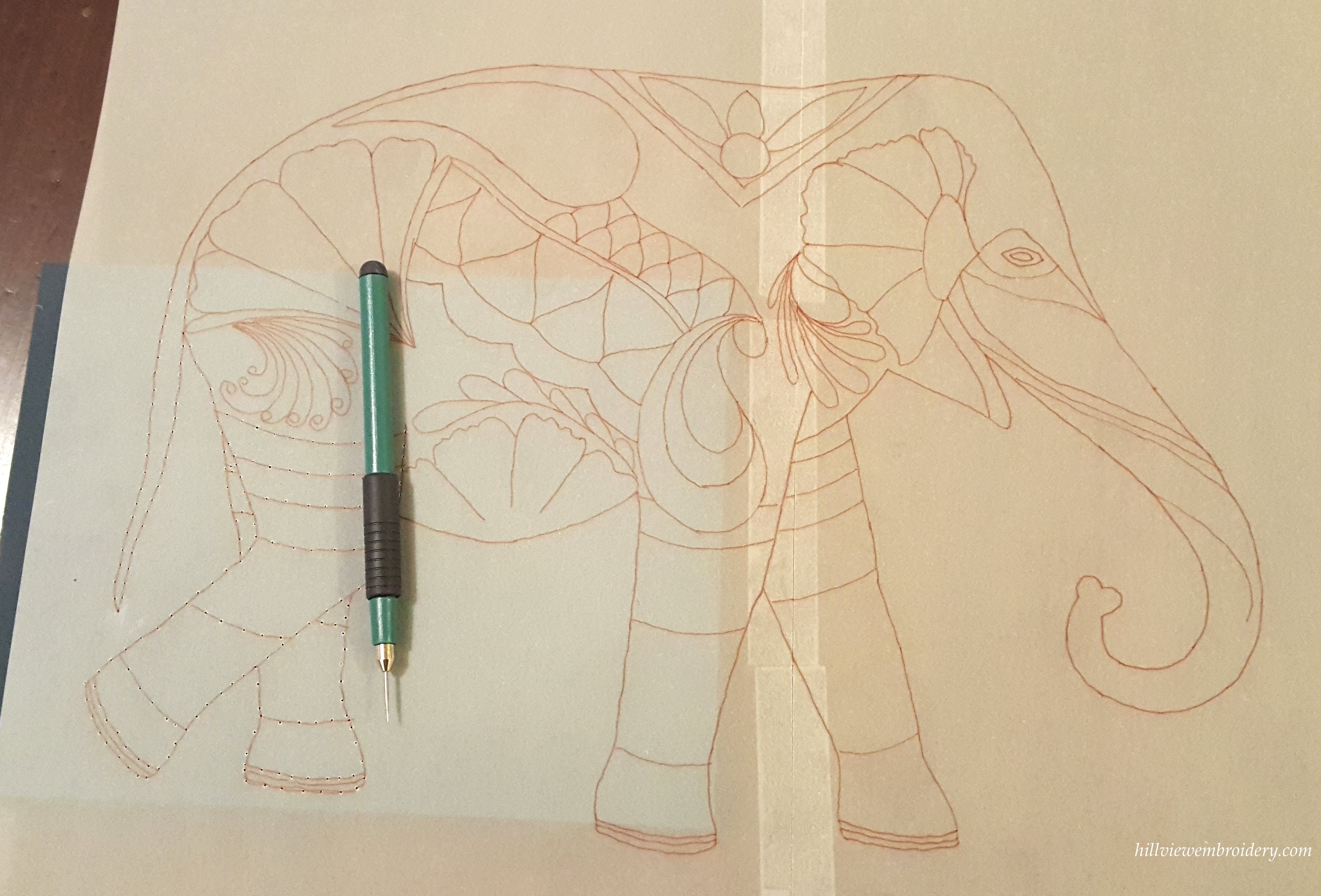 I have cheated on the design front, and have chosen the elephant out of Millie Marotta’s Animal Kingdom colouring book. I decided if I were to use the design in the same size as in the book, it would be too small, so the first step was to enlarge it onto an A3 size piece of paper. I made two copies. On one, I have penciled in some ideas for what stitch to use in some places of the design. The other copy I guess you could call my master copy. I used it to trace the design, and it will be my go to reference point throughout the stitching process.