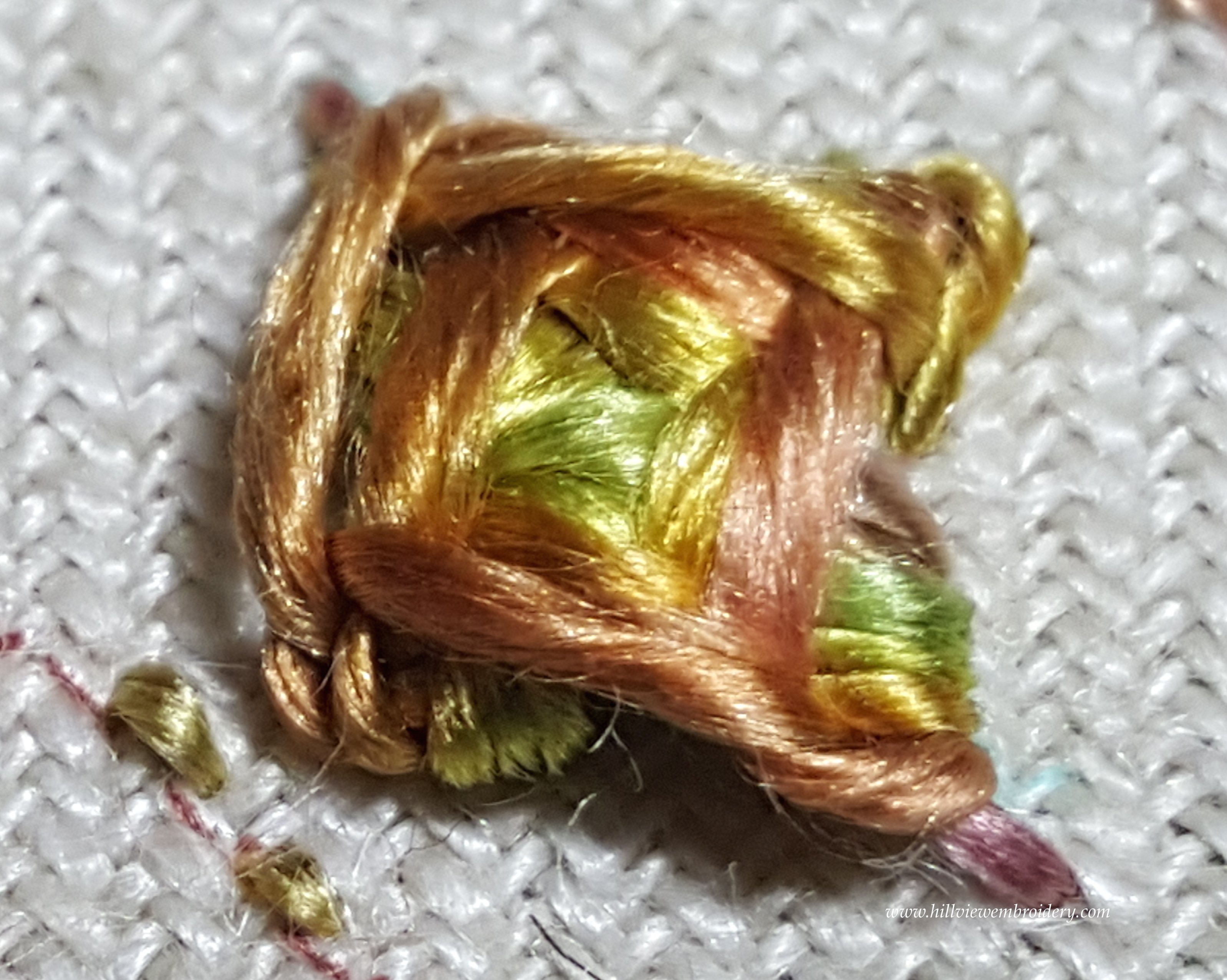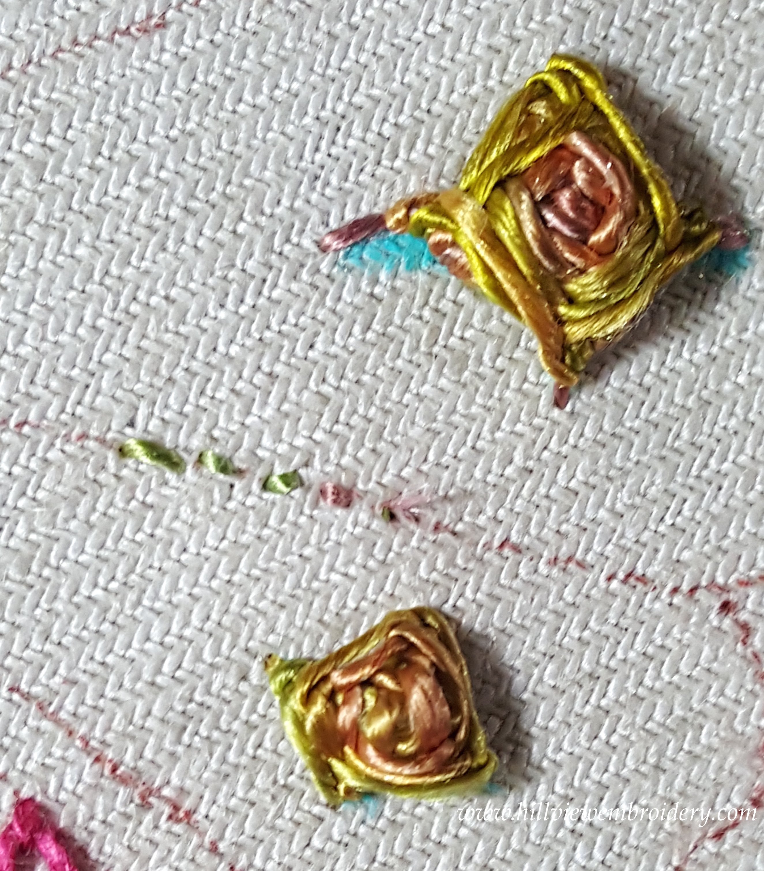 Again, I worked this stitch in a variegated thread, this time a silk thread by Colour Streams in Australia. It is a gorgeous thread! When you head over to Pintangle, you will see Sharon has worked this stitch in a variety of different threads, and one in ribbon, each giving lovely, though very different effects. The Colour Streams thread I used was easily divided into three ‘groups’ of strands, however each ‘group’ of strands from there then had another nine strands. Each of these is thinner than a DMC strand, but it was still a ‘bulky’ thread to use, similar to the thickness of an Appeltons wool strand, when using all nine thin strands, or one ‘group’. I really love the effect of the variegated thread in the rose, and am happy with the ‘thickness’ of the thread I used.