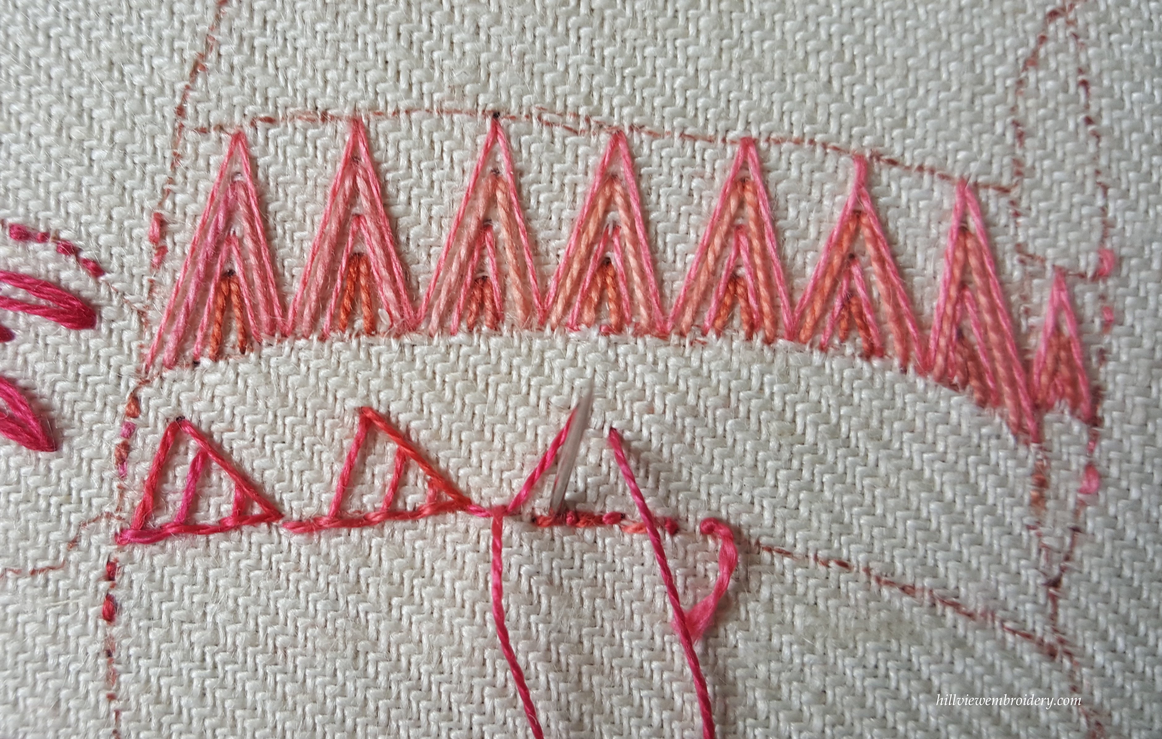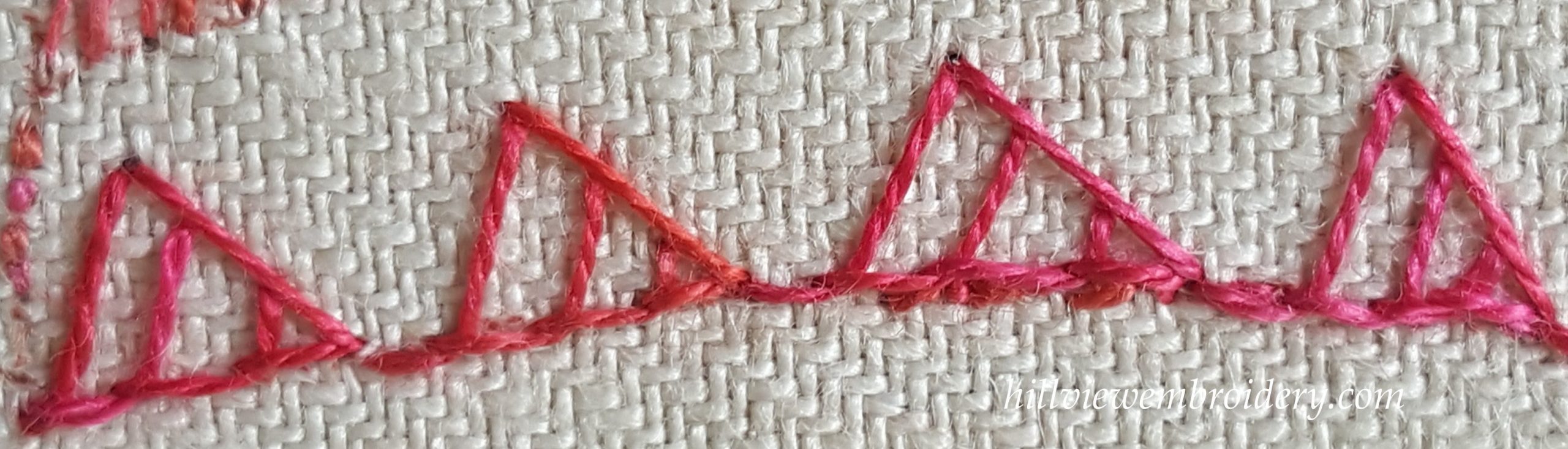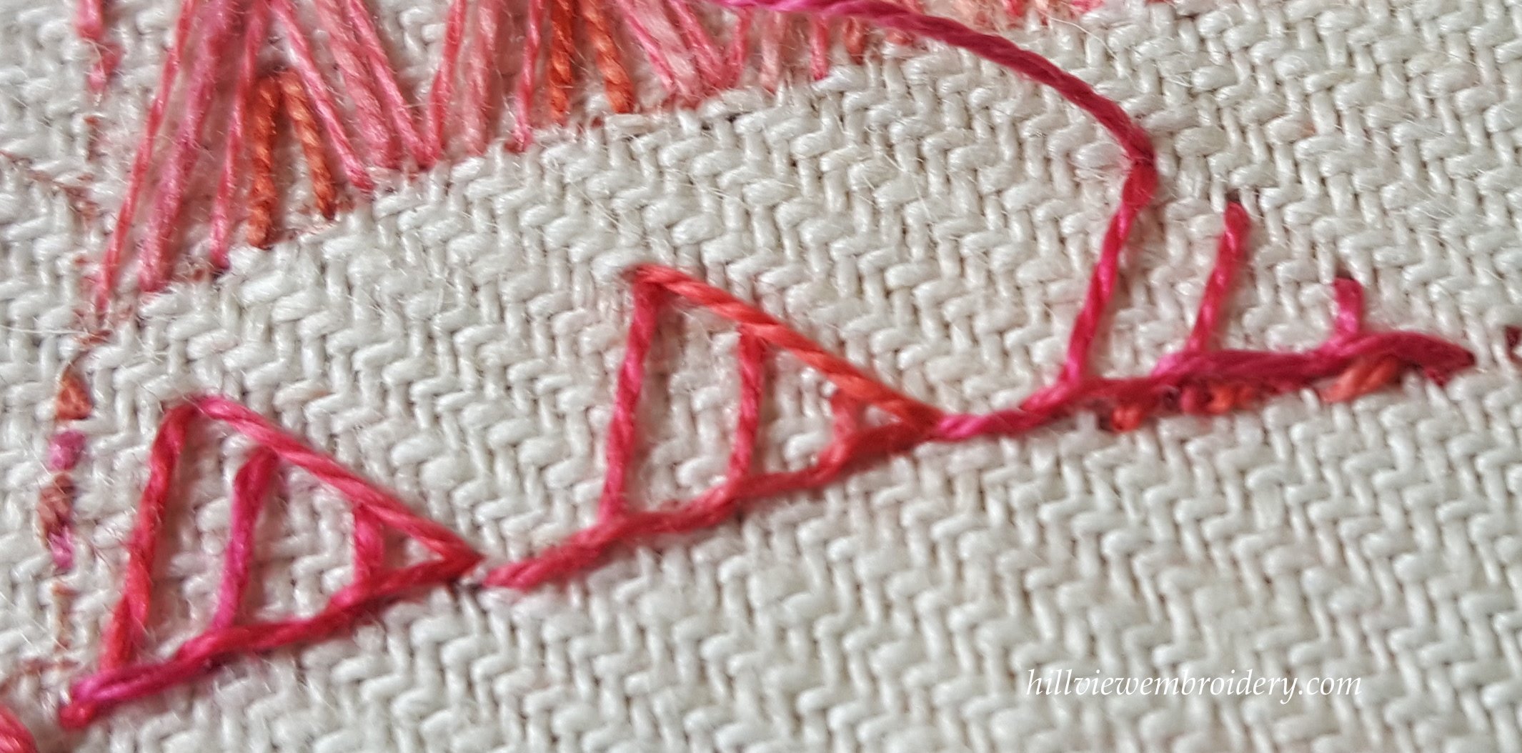 One thing I am struggling a little with a lot of these stitches is that I use a hoop or frame (I actually really struggle without one!), and the stitch instructions are always written from the perspective of a ‘sewer’ rather than a ‘stabber’ – I imagine for the ease of showing the stitch in photos and diagrams! So I do find myself having to adjust some of the stitches slightly to accommodate this. But, overall, I was happy with this result, I just need to work on getting the stitch ‘flowing’ better from one to the other. Having stopped and thought about it, if I were to put the final ‘side’ of the triangle in from bottom to top, rather than top to bottom, I don’t think this would be a problem! But that’s part of what this is all about – learning as we go along.
